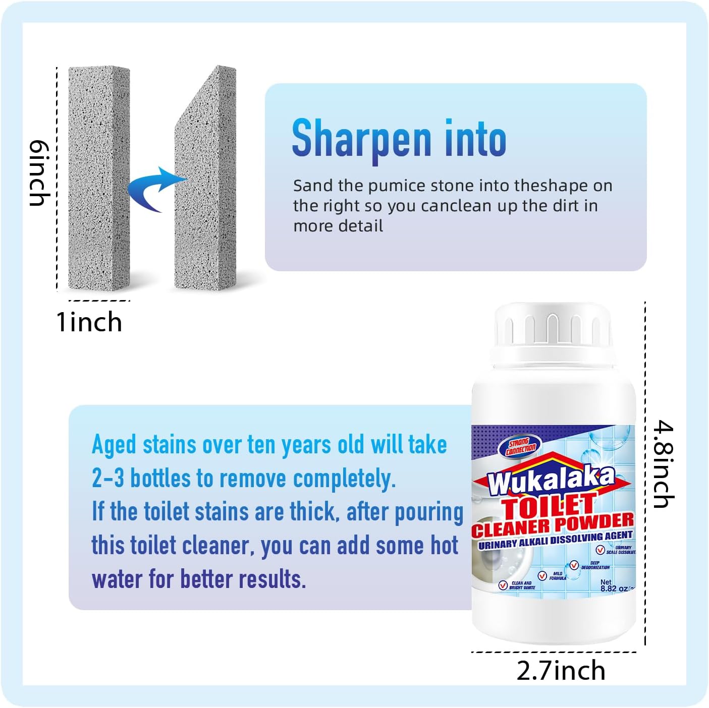 - 2.Instructions:Product 1 wet the pumice stone first for 15 to 20 seconds, then test in a small area, keep the pumice scrubber and toilet surface moist throughout use, and then wipe clockwise to easily remove the dirt. Product 2 will not produce foam. After pouring into the toilets, wait for 3 hours and rinse with water, it will become very clean.
