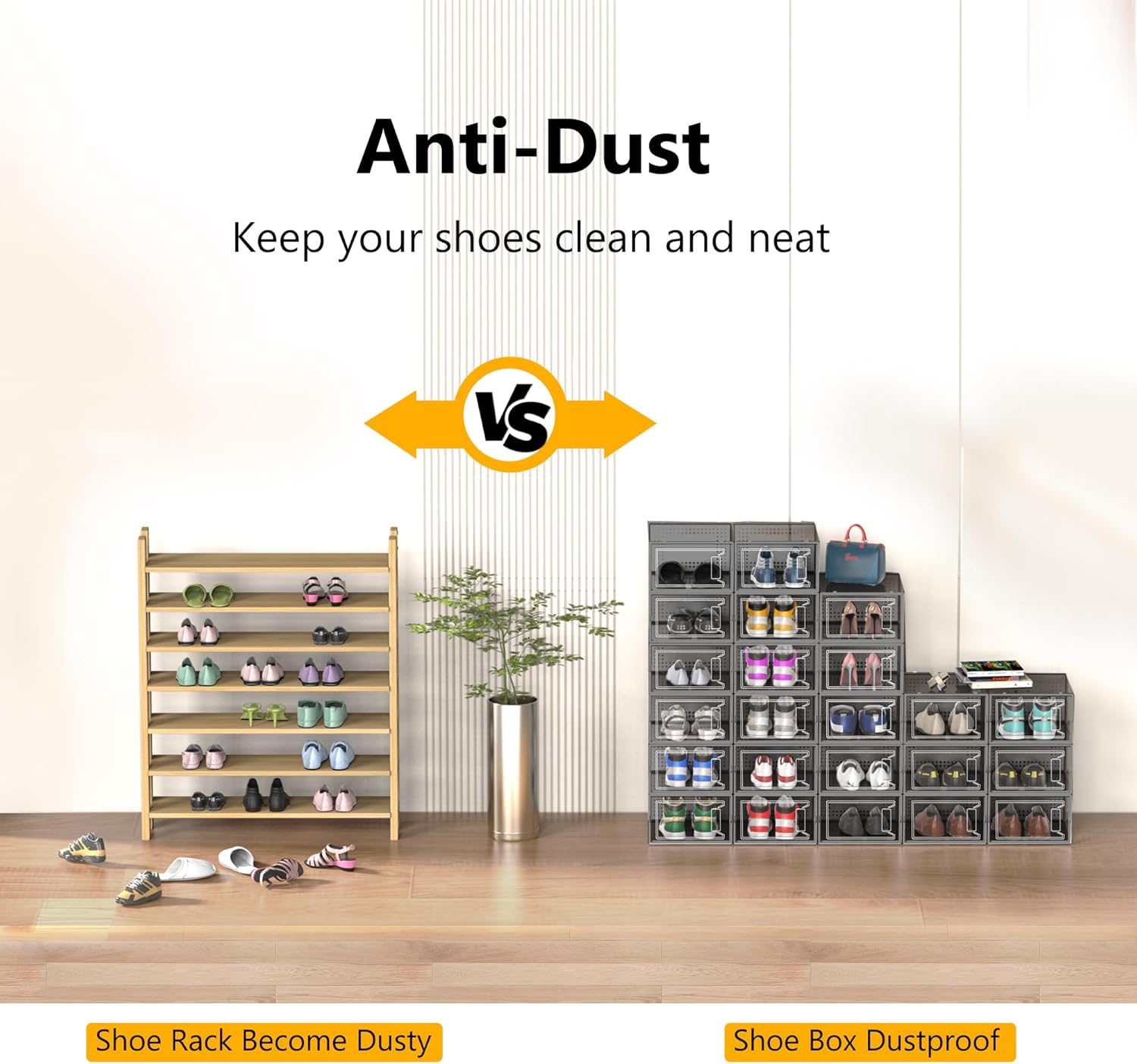 - Clear Shoe Manager: Clear shoe boxes stackable helps you search for your shoes quickly and efficiently, and ventilation design allows air circulation and odor prevention. Limited space saving fit for in the closet, wardrobe, hallway, entryway, bedroom, under bed and so on.