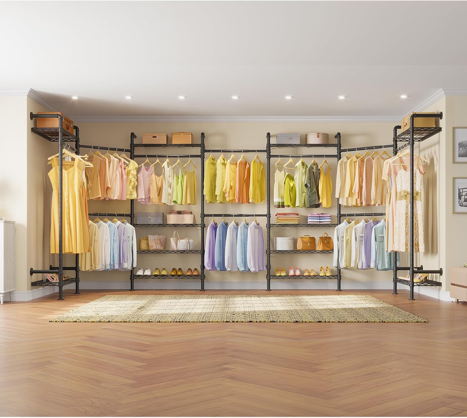- Sturdy and Reliable -- Our metal clothing rack for hanging clothes is made of high quality matte powder coated metal poles, racks and hanger. And therefore it's scratch-resistant, the strong metal pipe seamless sleeve is extremely reliable and wall-mounted closet can avoid sagging or wobbing. Max Load 950lbs