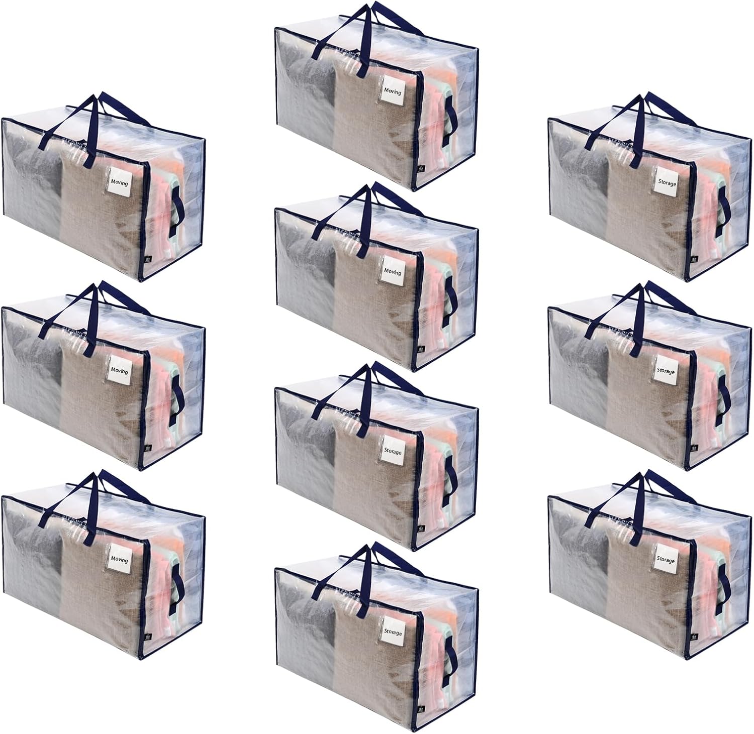 VENO 10 Pack Moving and Storage Bags, Heavy Duty, Alternative to Moving Boxes, Large Packing Totes Supplies for College Dorm Room with Zipper for Clothes, Wide Open Design (Clear, 10 Pack)