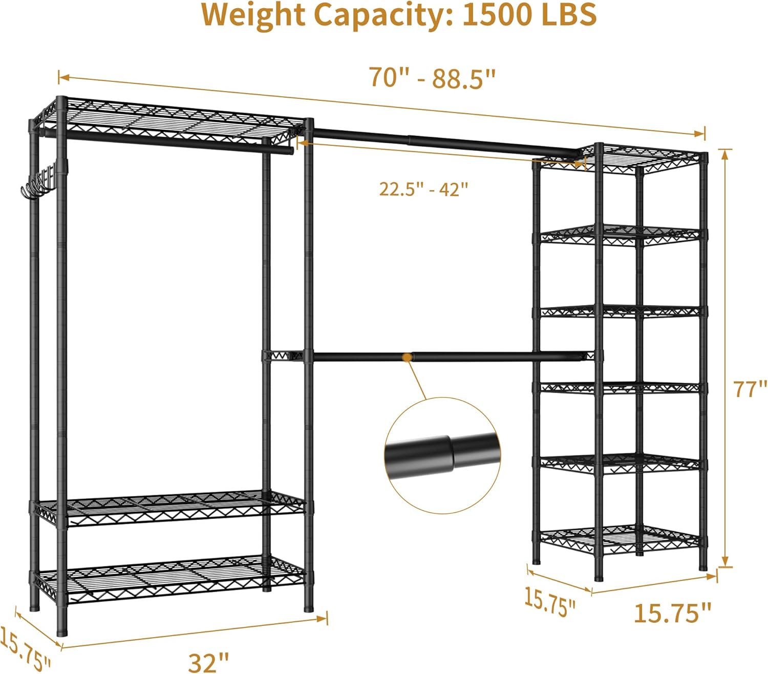 - Expandable Clothing Rack: Effortlessly customize your storage space with 2 extendable hanging rods, allowing the heavy-duty rack to adapt from 70 to 88.5 inches. Overall dimensions: 15.75"Dx(70"-88.5")Wx76.37"H, ensuring a perfect fit for diverse space dimensions