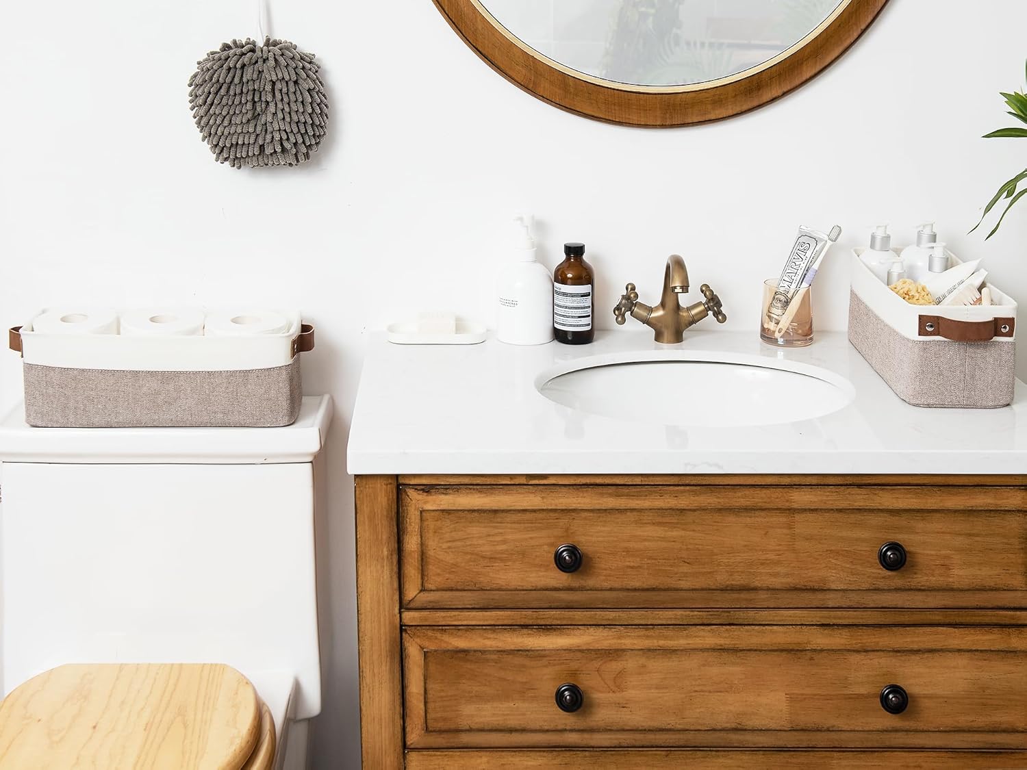 - The sleek modern design with 2 widened sewn-in handles makes this small basket a great addition to any home.