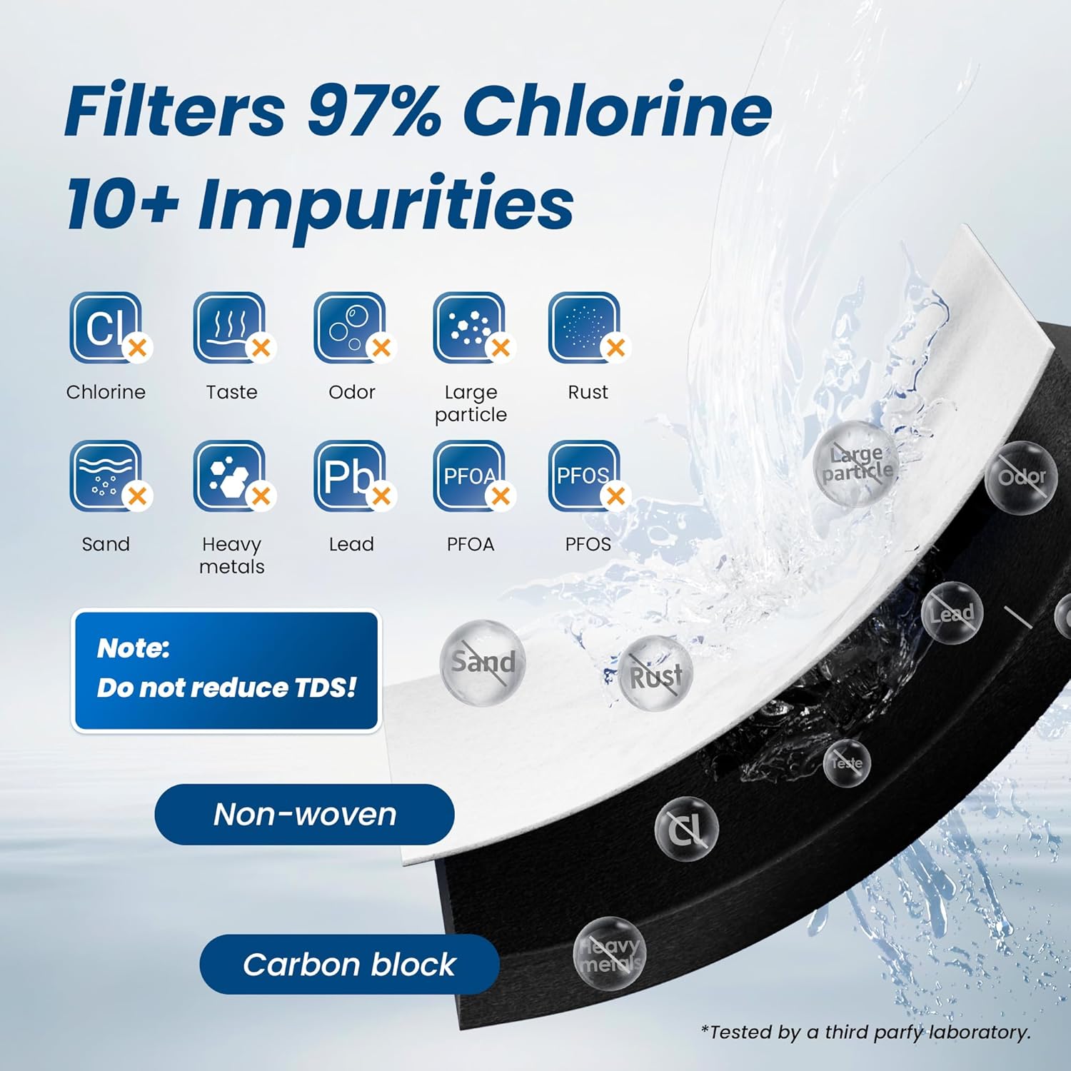 - Brilliant filtration: The filter can reduce a wide range of harmful substances in water including heavy metals, chlorine, odor, THM, VOCs, particles, cadmium, and all other major impurities, which has been tested by an independent third-party laboratory.
