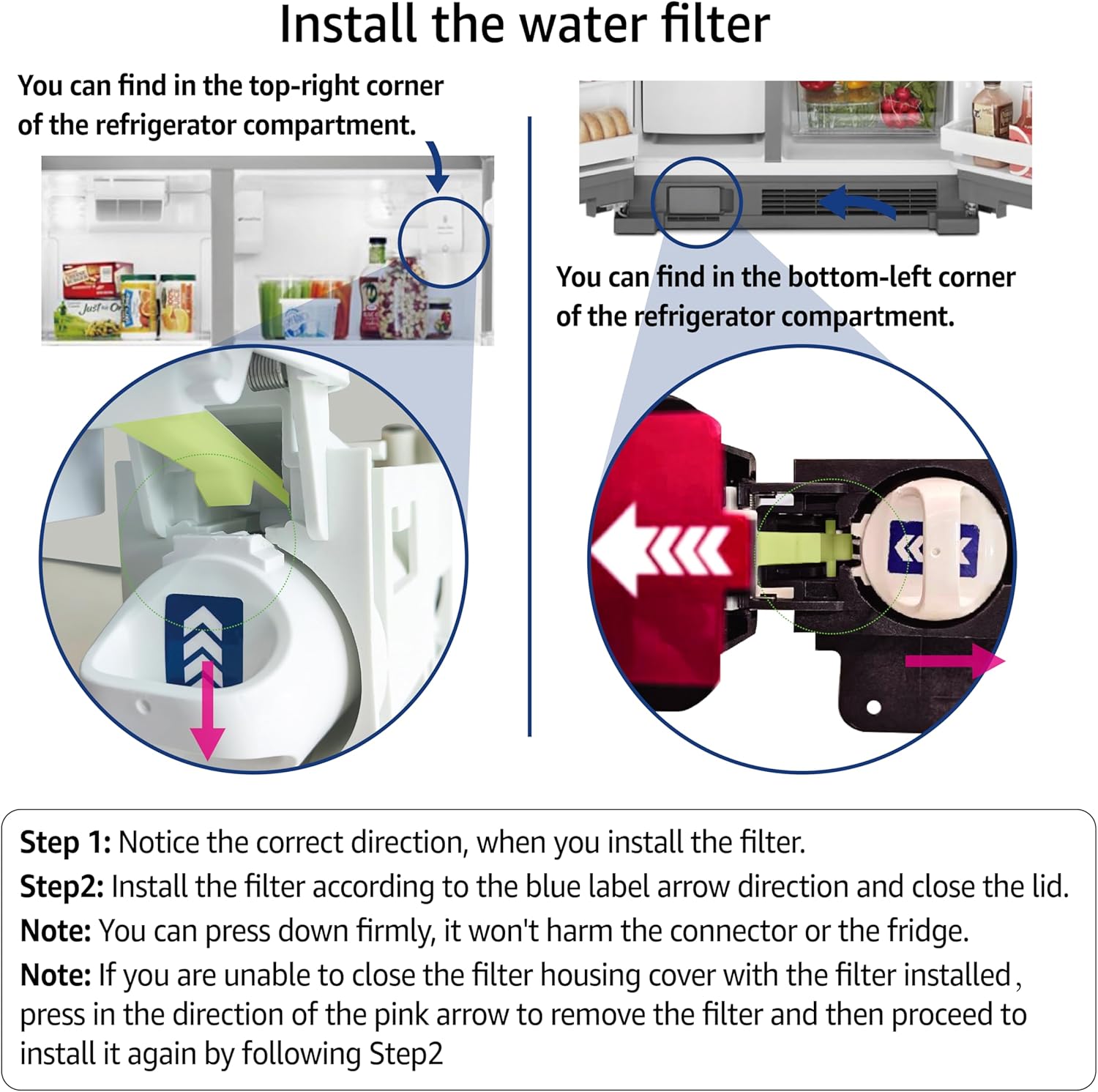 - Note:When you install the filter, if you find the lid cannot be closed, please press down the filter hard to ensure that it is installed in place, then the filter lid can be closed.