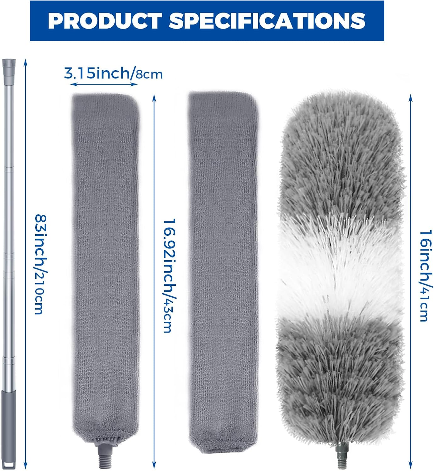 - 【100" EXTENDABLE LONG POLE DUSTER】The extension pole is made of durable stainless steel, it can be adjusted from 30 inches to a whopping 100 inches, allowing you to reach even the highest nooks and crannies. No more teetering on ladders or straining your back by squatting on the floor. With our cobweb duster with extension pole, you can clean more areas effortlessly and also more safely and efficiently. Due to extendable properties which is convenient storage and it does not occupy any space.