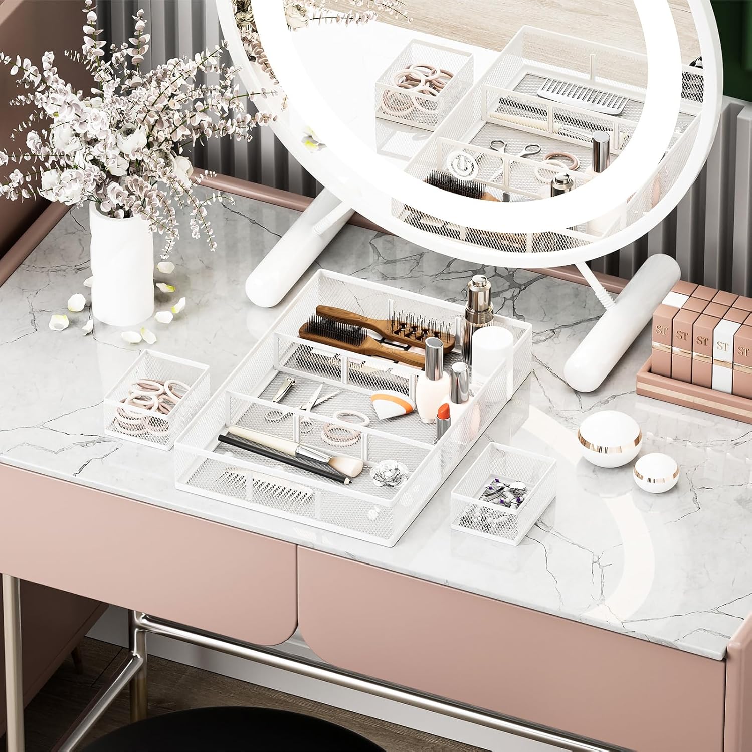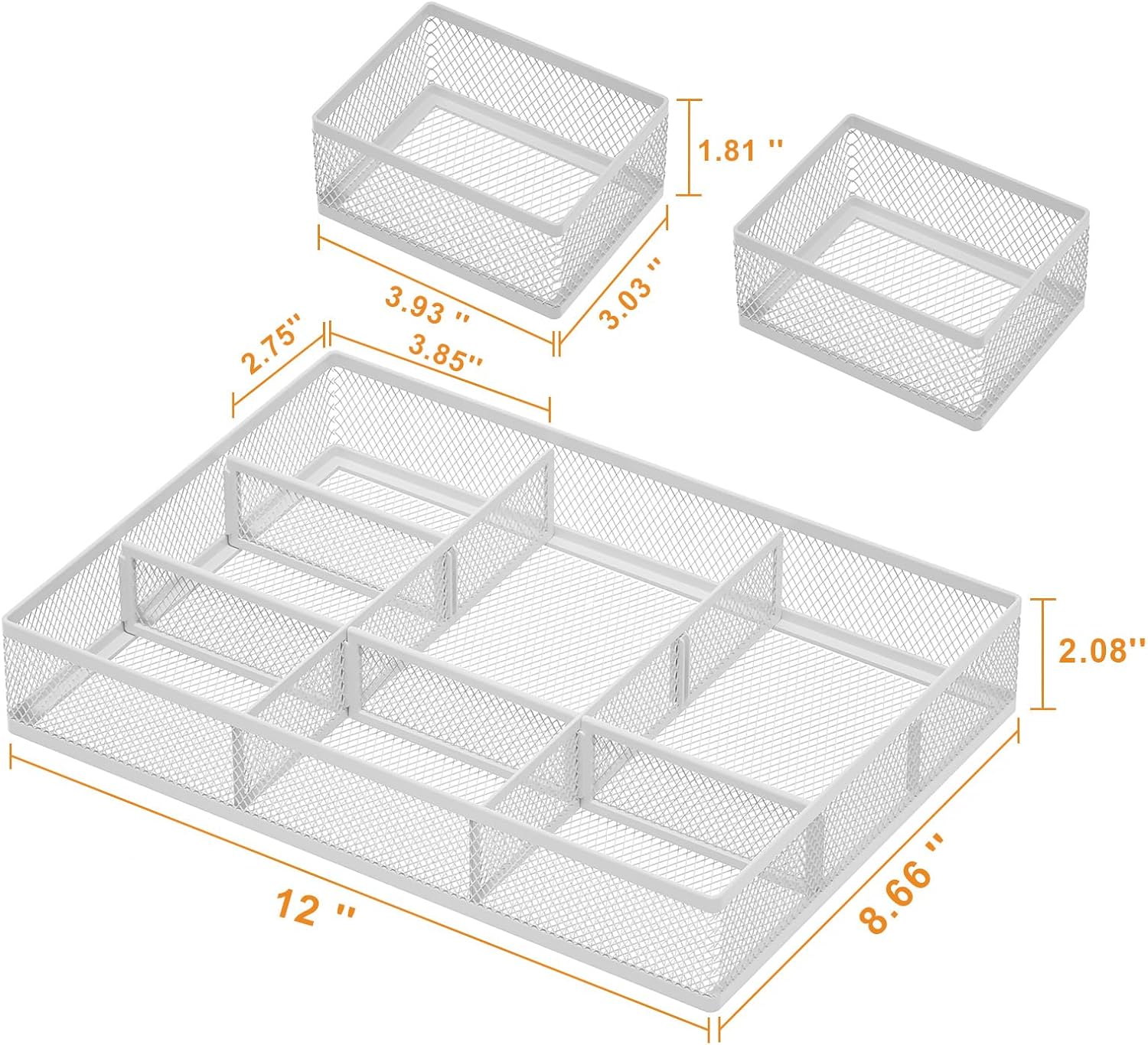 - 【Stury and Durable】Made of sturdy black wire mesh structure with powder coated surface, smooth and corrosion-resistant. Non-slip feet can keep the product stable.Big Drawer:12*8.3*2.2inches;2PC Small Drawers:3.5*3*1.9inches