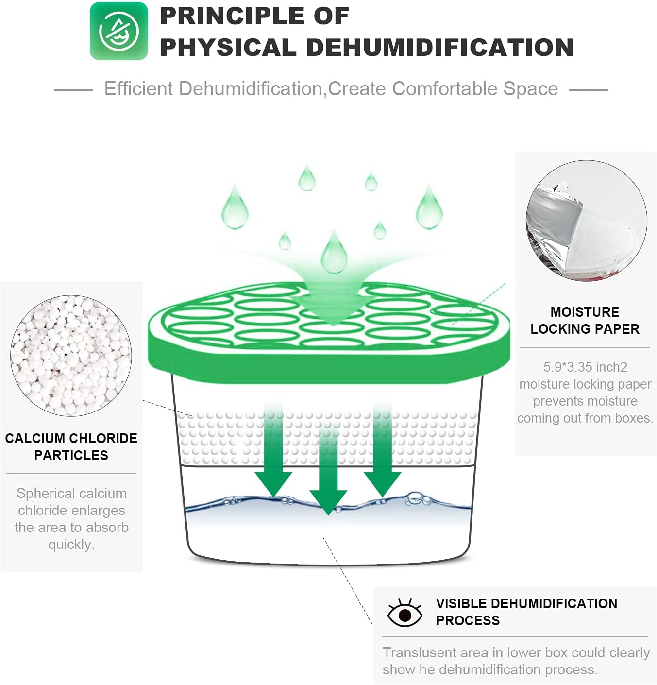 - 【SAFE & GREEN DESIGN】Use One-way moisture permeable paper, You don't have to worry about water will leak. Designed for Shoe Cabinet, bedroom, kitchen, sitting room,bathrooms,closets,laundry rooms,basements and more.Physical dehumidification gives you a Safe, Green & Energy-saving life.When the container is filled, The box can be disposed of safely down the drain and recycled.