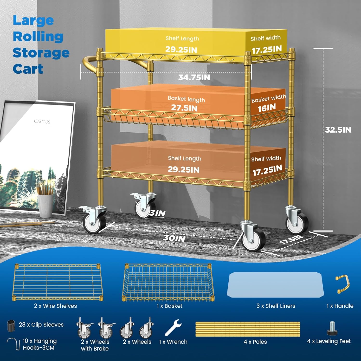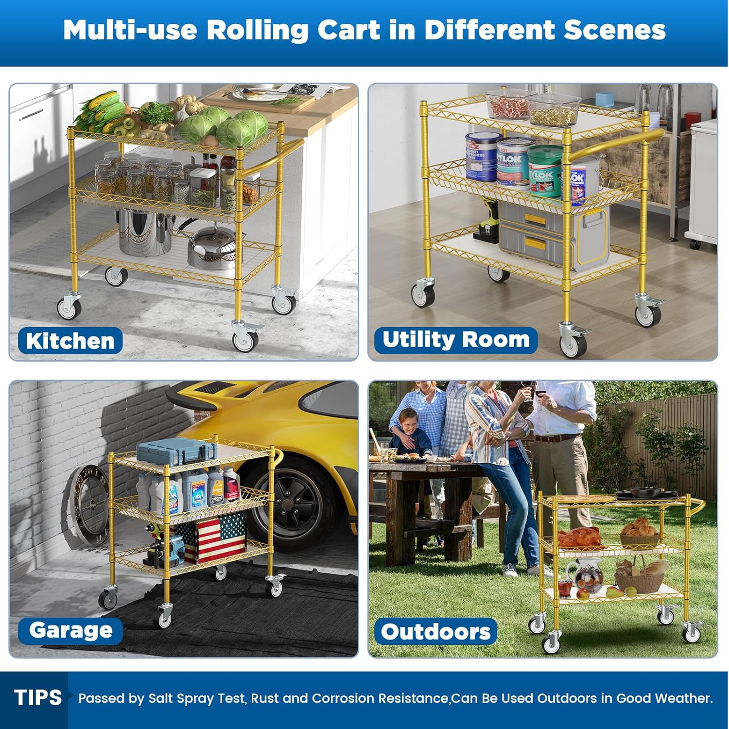 Leteuke 3 Tier Rolling Carts with Wheels,Heavy Duty Utility Bar Cart,NSF Commercial Grade Metal Cart with Handle&Shelf Liner,Trolley Serving Cart for Kitchen,Restaurant,Plant Display,Gold
