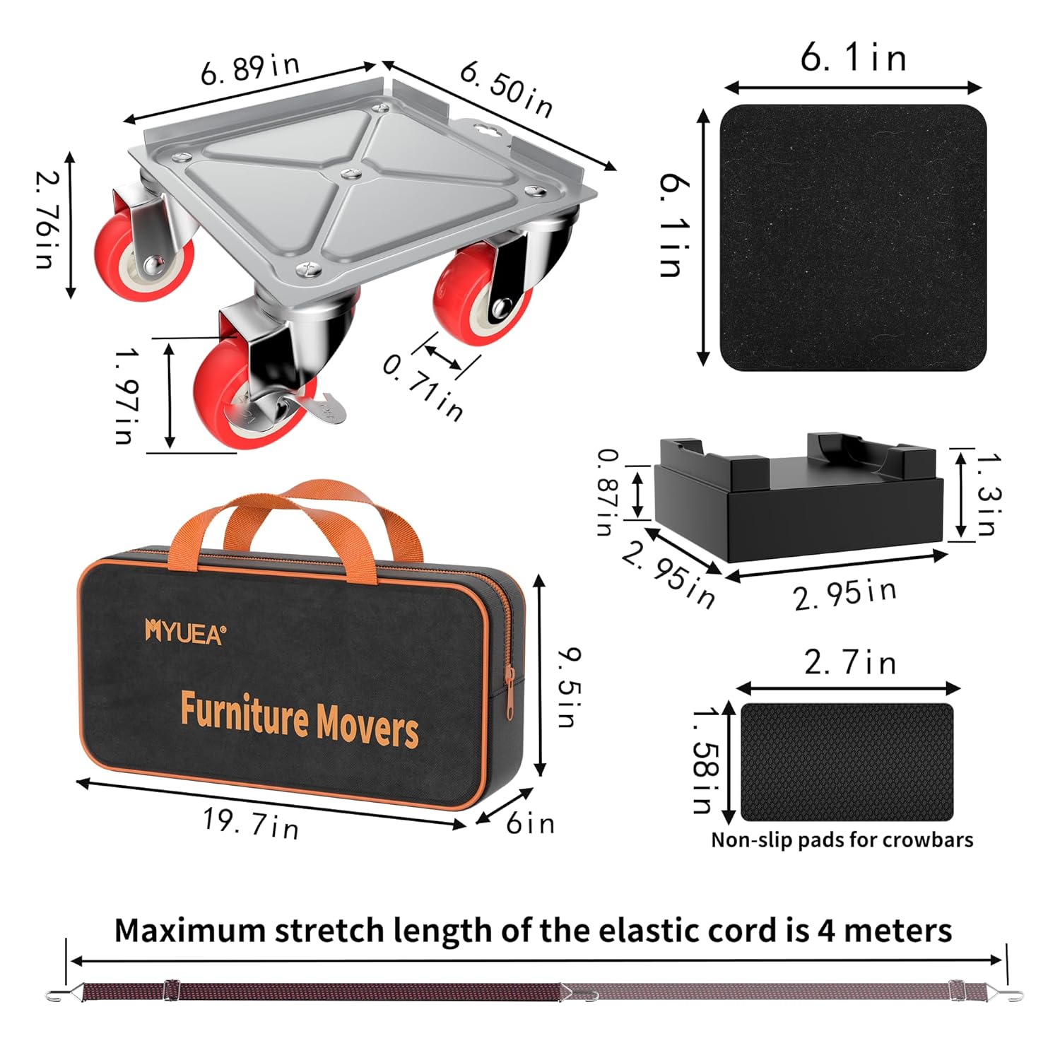- [SURPRISE GIFT PACKAGE]:Upgraded large panel furniture dollies set, including four 6.5 x 6.5 in moving dolly,1 x pry bar,4 x heightening spacers,4 x flannel non-slip mats,2 x rubber anti-slip mats,1 x pair of safety gloves,1 x Canvas Tote Bag,1 x elastic cord.