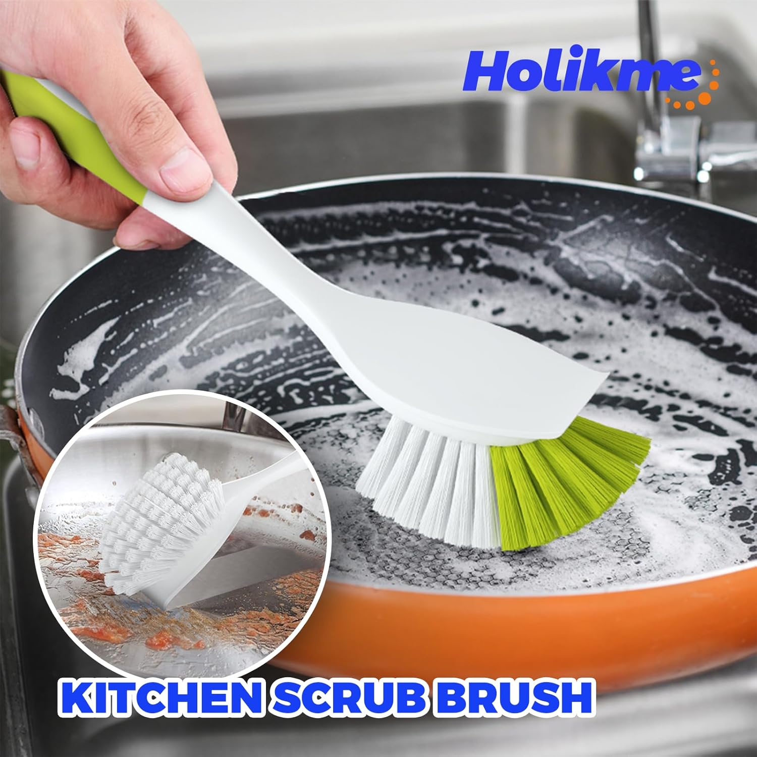 - Dish cleaning brushes have nylon bristles which are easily scrub the stains away; Built-in scraper removes baked-on spots; It can clean the pots, pans, dishes and etc.