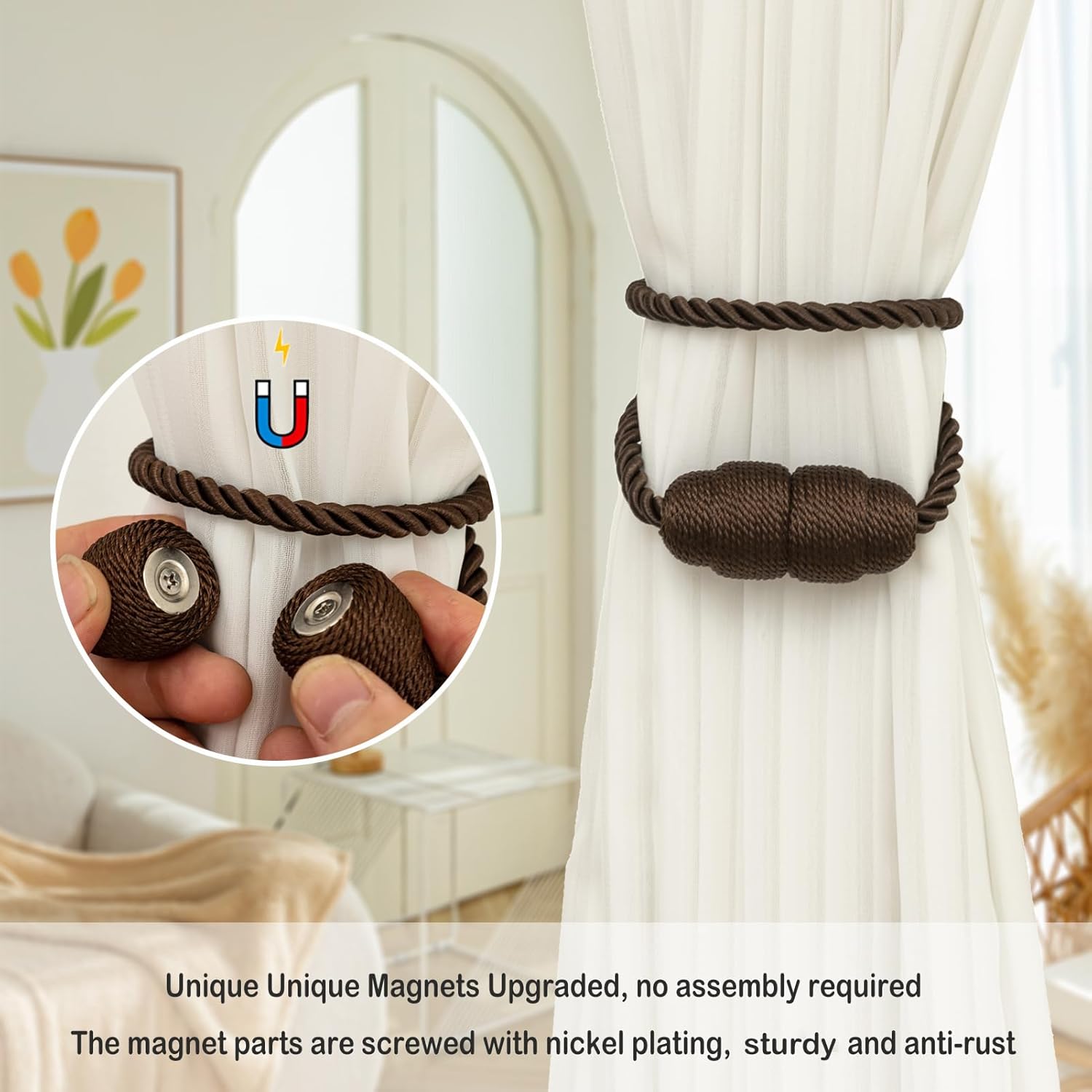 Magnetic Curtain Tiebacks Rope Curtain Tie Backs for Curtains 2 Pack Curtain Holders for Drapes Decorative Window Curtain Holdbacks, Coffee