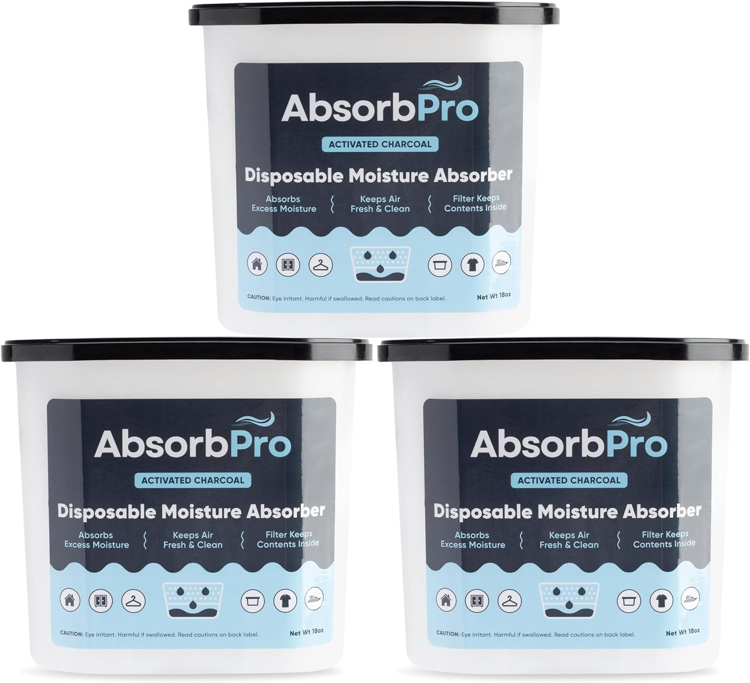Moisture Absorber Tub with Activated Charcoal - 3-Pack - 18 oz Disposable Odor Eliminator Box & Dehumidifier for Garage, Home, Kitchen, Bedroom, Bathroom, Closet, Cars, and Boats