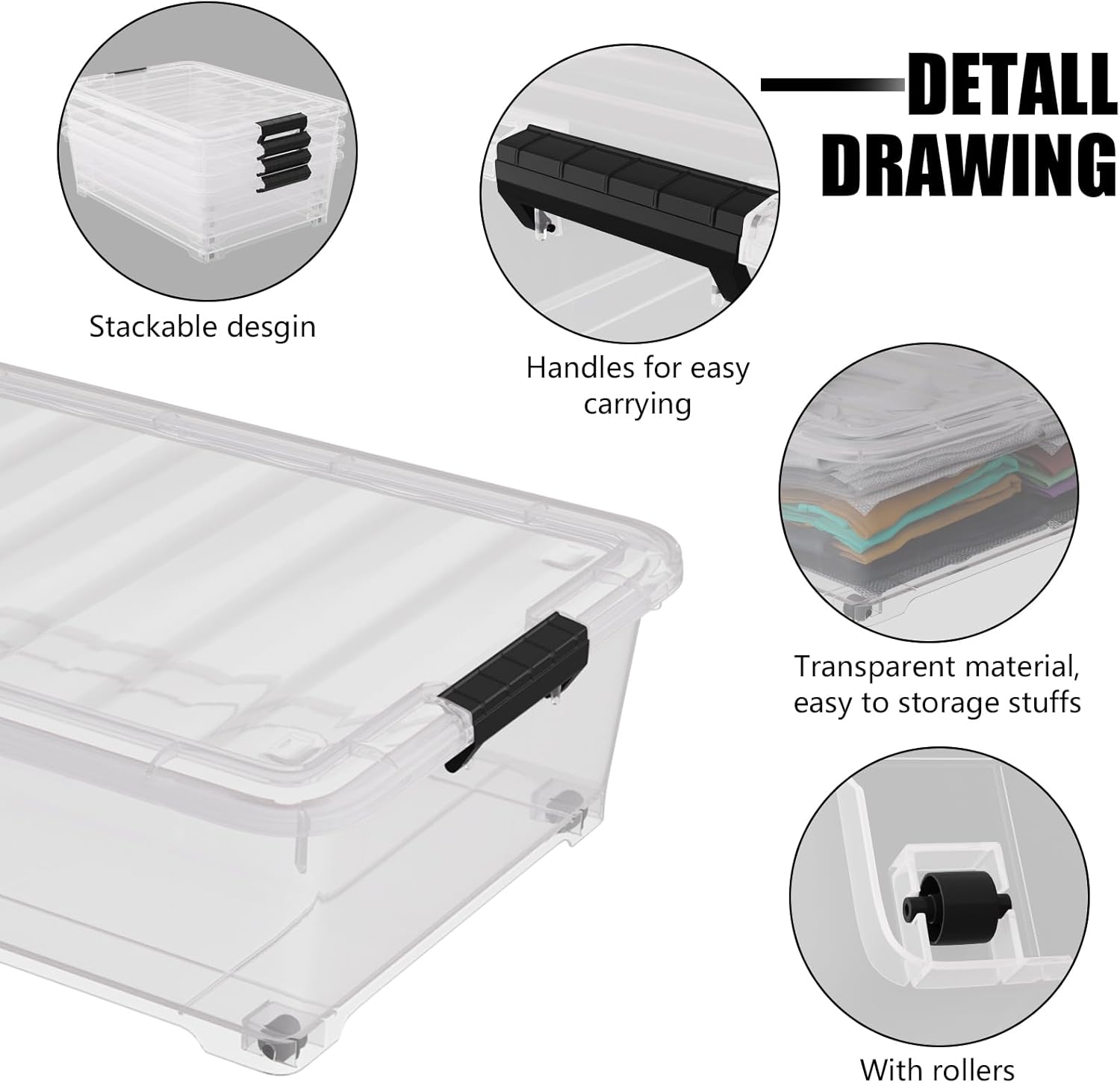 - The transparent box is easy to see the items, making it easy to quickly find them. It can store clothes, toys, tools, and bed sheets