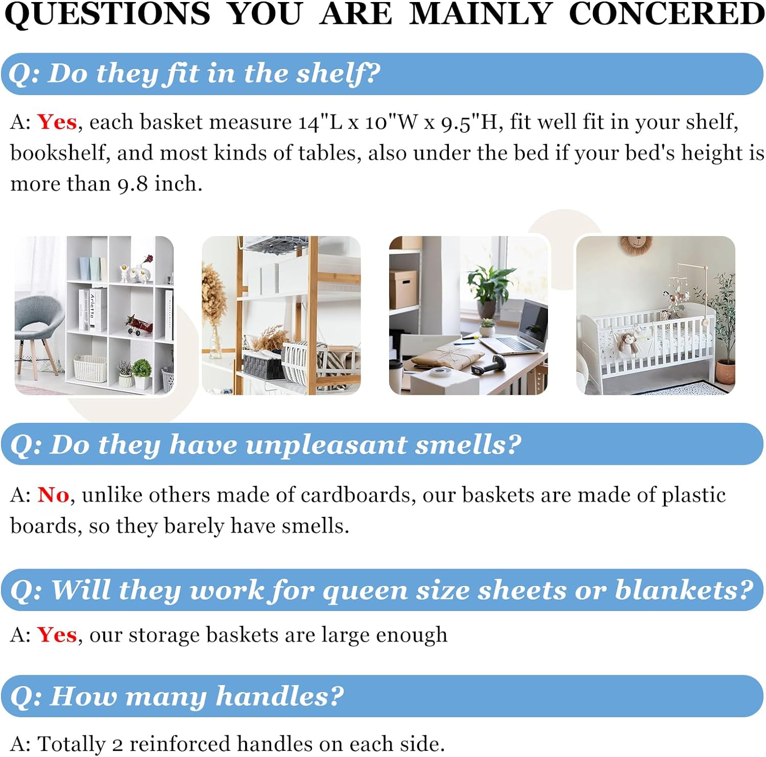 - 【FIT RANGE】 Comes with 6 pack for better value, these cloth storage bins could meet all your family storage needs, also for college dorm, RV, school, baby nursery. Measuring 14” (L) x 10” (W) x 9.5” (H), they could work as storage baskets for shelves, closet storage bins, shelf bins, under bed storage bins, or for changing tables.