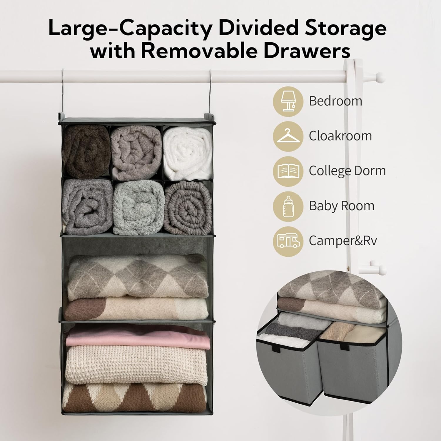 GRANNY SAYS Hanging Closet Organizer with Drawers, 4 Shelf Dividers Closet Hanging Organizer, Foldable Hanging Shelves for Wardrobe Closet, Small Closet Organizers for Clothes Shoes, Grey