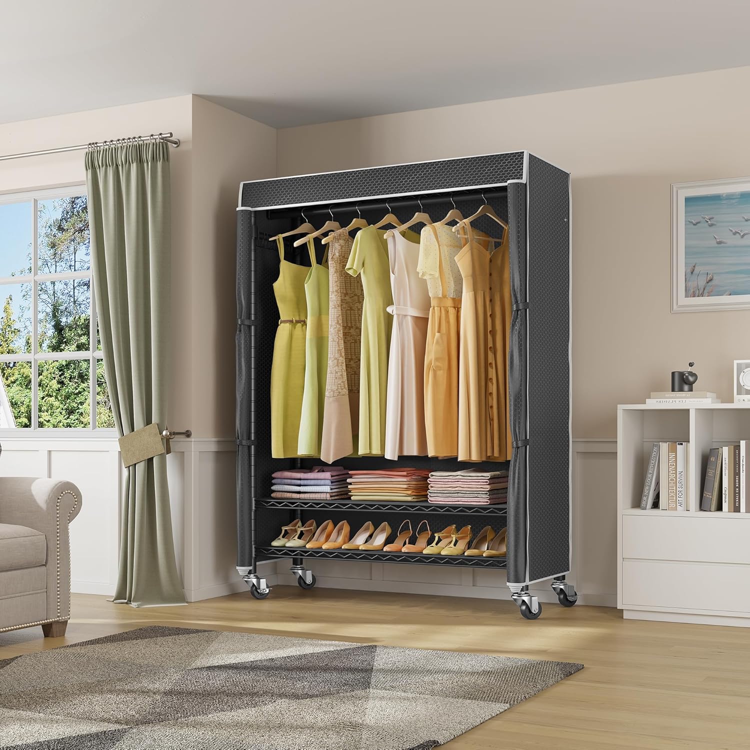 - 【Zippered Polyester Fabric Cover】Closet comes with upgraded polyester fabric cover, sturdy, wrinkle resistance, breathability keep garments dry. Easy to clean with damp cloth, and to keep your item away from dust.