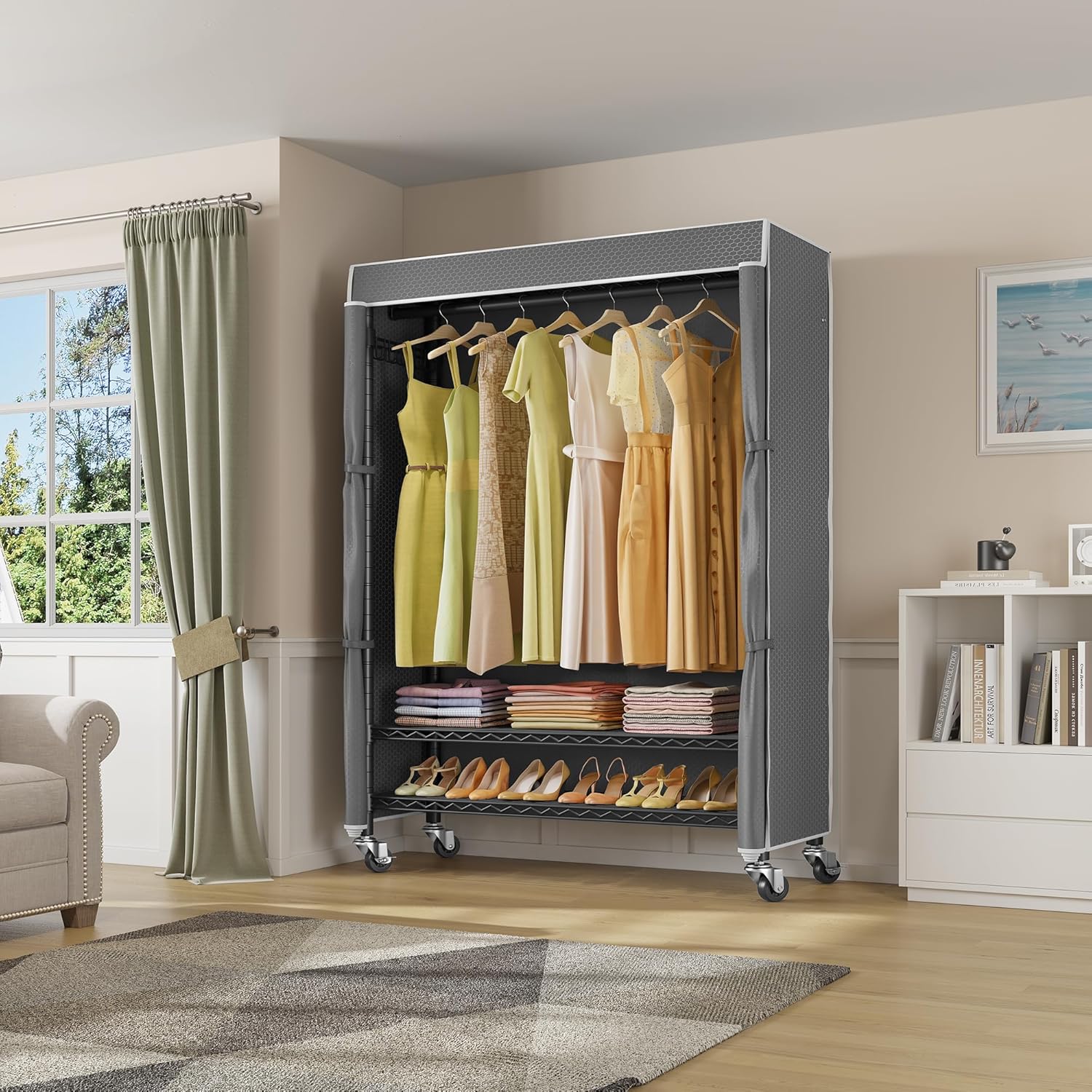 VIPEK R3C Plus Garment Rack Rolling Clothes Racks with Locking Wheels, Heavy Duty Clothing Rack Portable Closet with Adjustable Shelves & Side Hooks, Black Rack with Grey Upgraded Polyester Cover