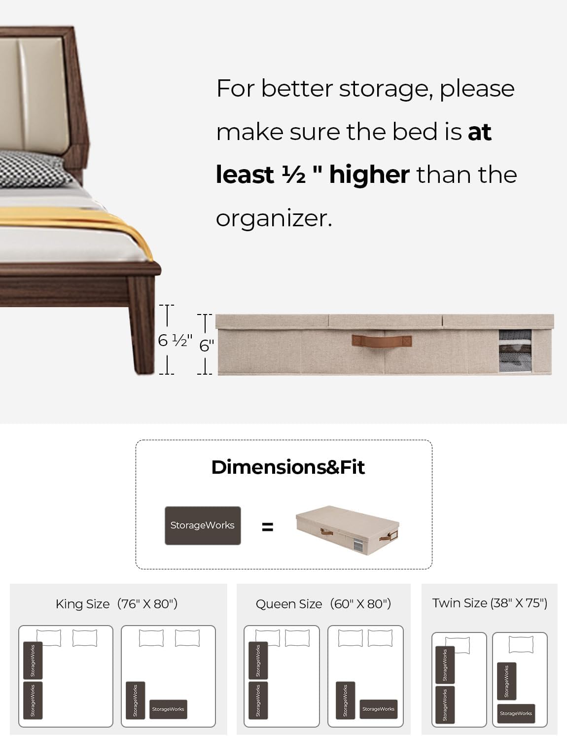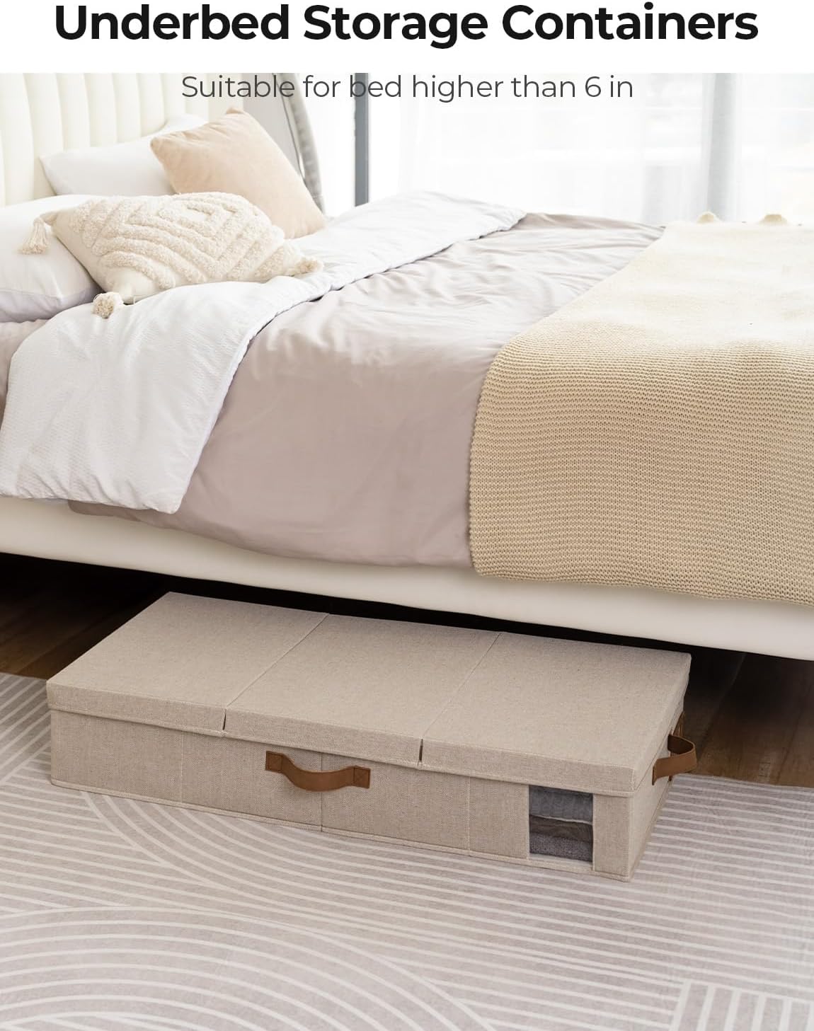 - Large Capacity: With dimensions of 33 x 17 x 6 inches, the under bed storage containers offer ample space for storing a range of items, including clothes, blankets, bedding and shoes, maximizing your underbed storage space and organizing your bedroom. Please make sure that your bed is at least 6.5 inches high for better use.