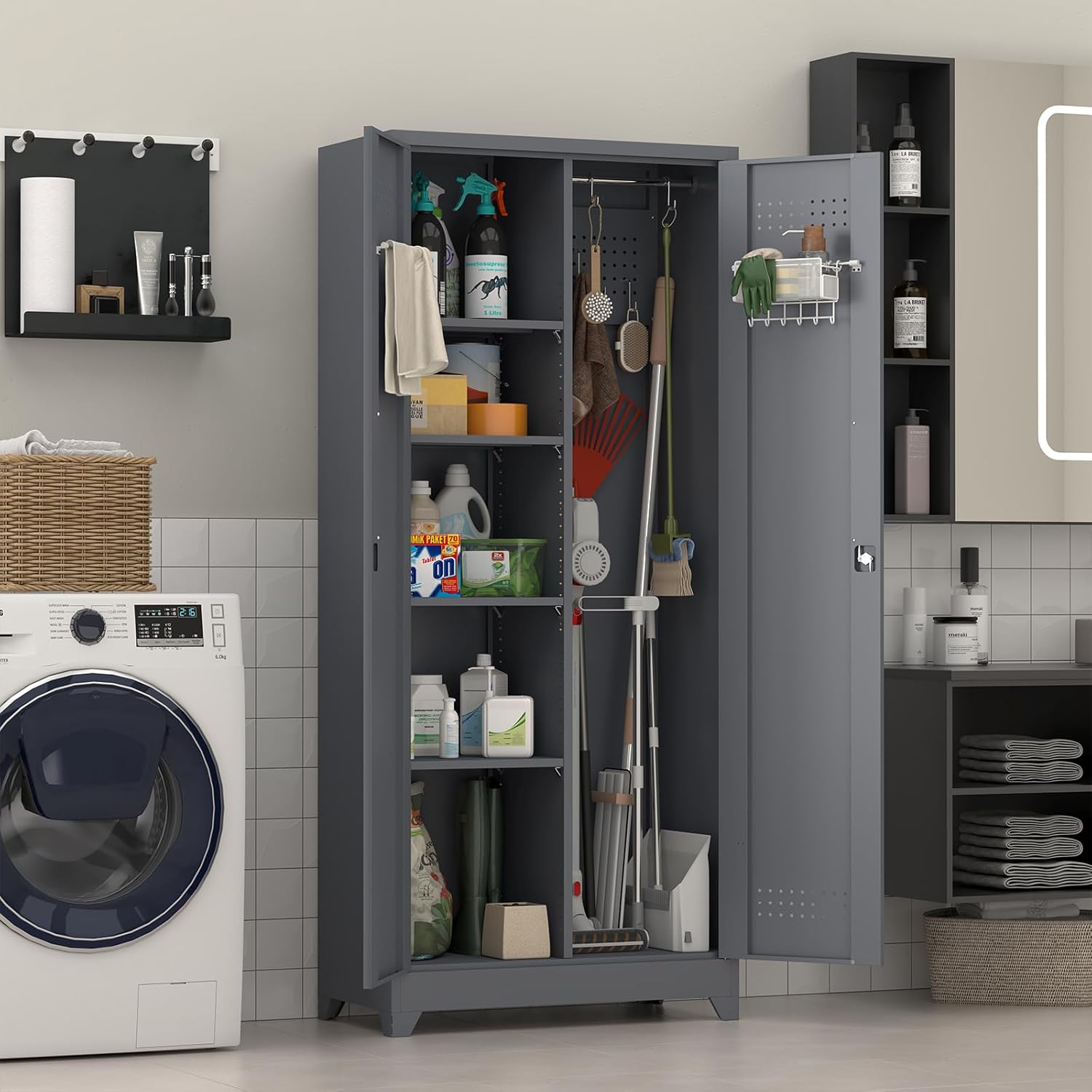 - [Multifunctional design]: This cleaning tool storage cabinet design with clothes rails, pegboard and adjustable shelves allows you to flexibly arrange the internal space to meet the storage needs of different items, suitable for offices, storage rooms, utility room, gym, garage