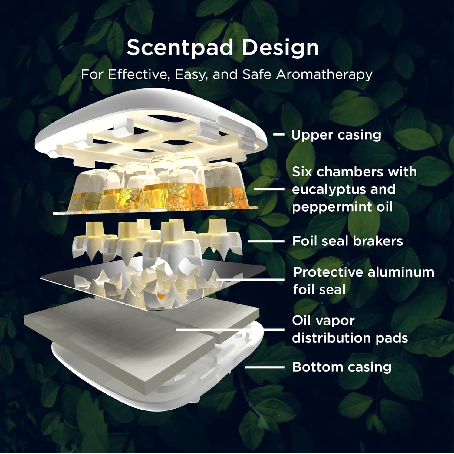 - 𝗖𝗼𝗻𝘃𝗲𝗻𝗶𝗲𝗻𝘁, 𝗟𝗼𝗻𝗴-𝗟𝗮𝘀𝘁𝗶𝗻𝗴 𝗔𝗿𝗼𝗺𝗮𝘁𝗶𝗰 𝗥𝗲𝗹𝗶𝗲𝗳: Thre box contains 4 ScentPads each with 6 essential oil reservoirs, giving you a total of 24 uses. One reservoir can be used multiple times in a day, making it easy to enjoy continuous, hassle-free aromatherapy whenever you need it.