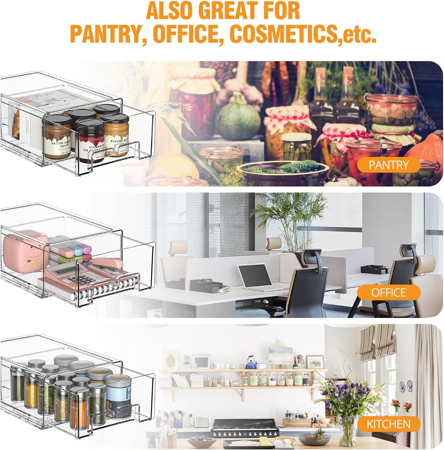 - GREAT VALUE OF STORAGE AND ORGANIZATION : Stackable storage drawers is not only a good refrigerator storage containers for fridge organizers and storage, but also for pantry, office, cosmetics, bathroom, medicine, tools, coffee, etc. Measuring 12.13 x 8.39 x 4.33 inches exterior and 11.69 x 7.99 x 3.58 inches interior