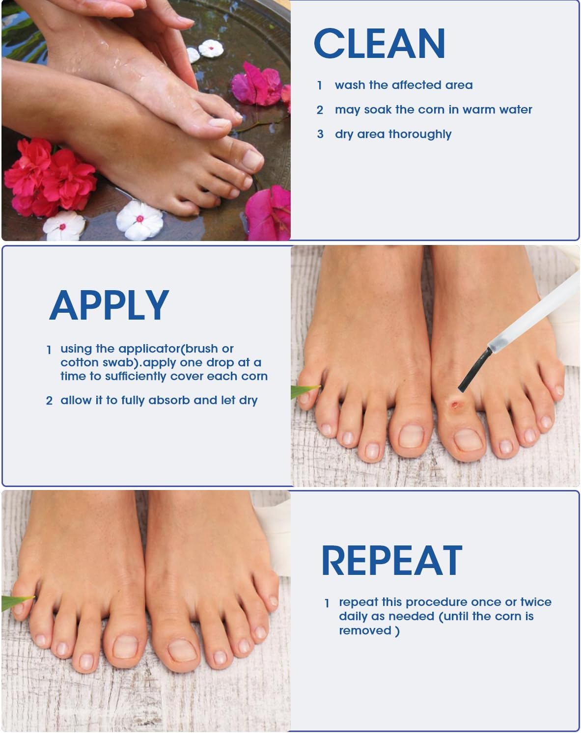 - USE: Wash affected area and dry thoroughly. Apply one drop at a time with applicator, to sufficiently cover each corn/callus; let dry.You can use complimentary cushions with hole centered over corn to relieve pressure