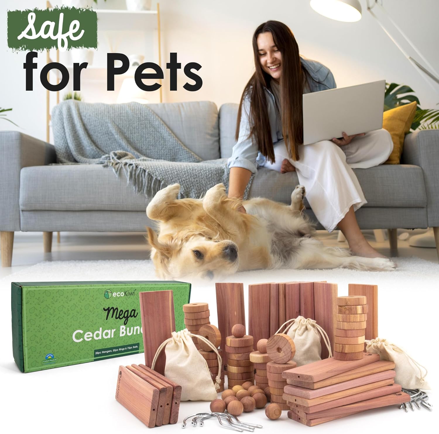 ecoKiwi Cedar Blocks for Clothes Storage Mega Bundle Box - Cedar Hangers x20, Balls x75 & Rings x55-100% Natural Oil Planks & Chips for Closets & Drawers - Aromatic Red Cedar Wood with Sandpaper