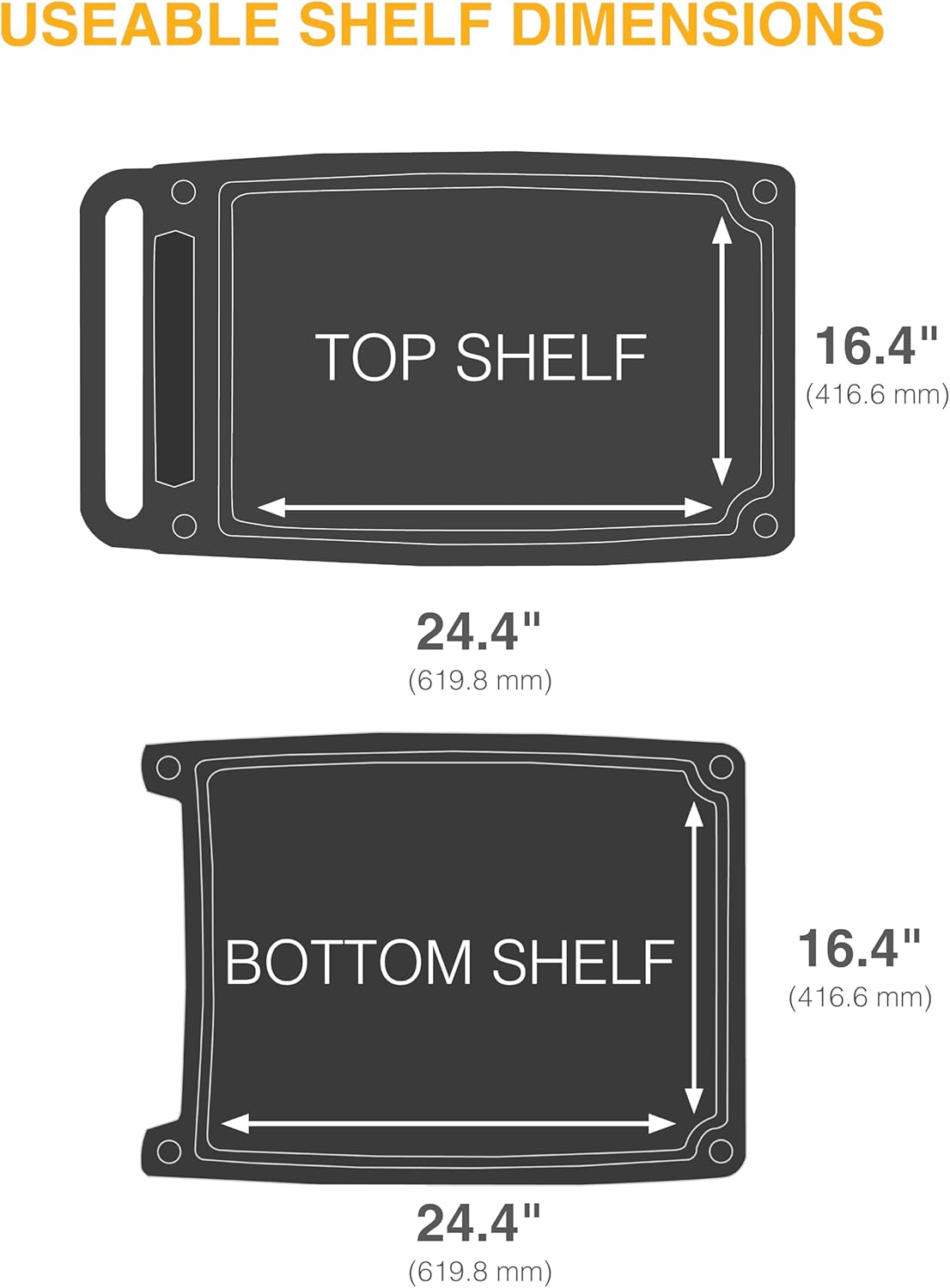 - Built to Handle the Toughest Loads: Maximize storage efficiency in any space with this 2-shelf cart. With a maximum weight capacity of 300 lbs (136 kg), this cart allows you to conquer demanding storage challenges. Each shelf supports up to 150 lbs (68 kg) of tools, supplies, or equipment, keeping everything organized and readily accessible.