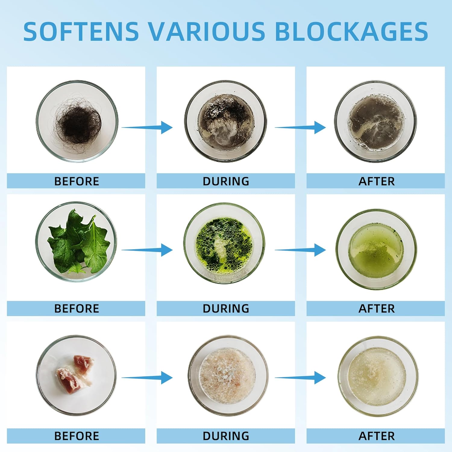 - Powerful Performance: Our drain clog remover is engineered to swiftly tackle even the toughest clogs, whether it's hair, grease, soap scum, or food residue. With its potent formula, it dissolves blockages effectively, restoring your drains to optimal functionality in no time