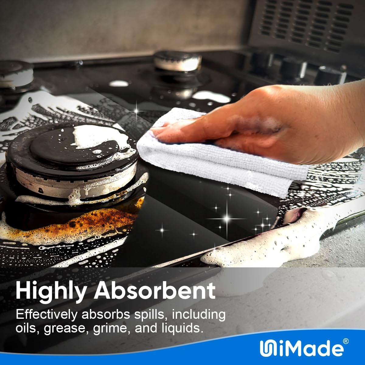 - Powerful Cleaning: Unimade commercial grade microfiber cleaning cloths boast exceptional cleaning power, tackling messes with ease. From spills to stains, they deliver a thorough clean every time. Say goodbye to stubborn stains and spills with our shop towels
