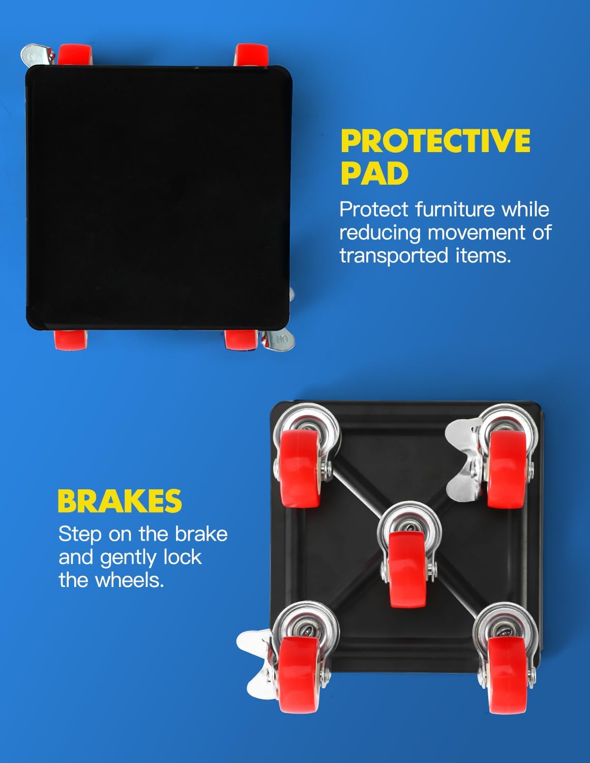 - COMPLETELY UPGRADED – The upgraded moving tool now features 5 wheels, a reinforced load-bearing steel plate, and enhanced weight limit. The wheels are made of soft rubber material to effectively protect your floors. A single moving dolly can lift 300 pounds, and when four working together, they can handle up to 1200 pounds