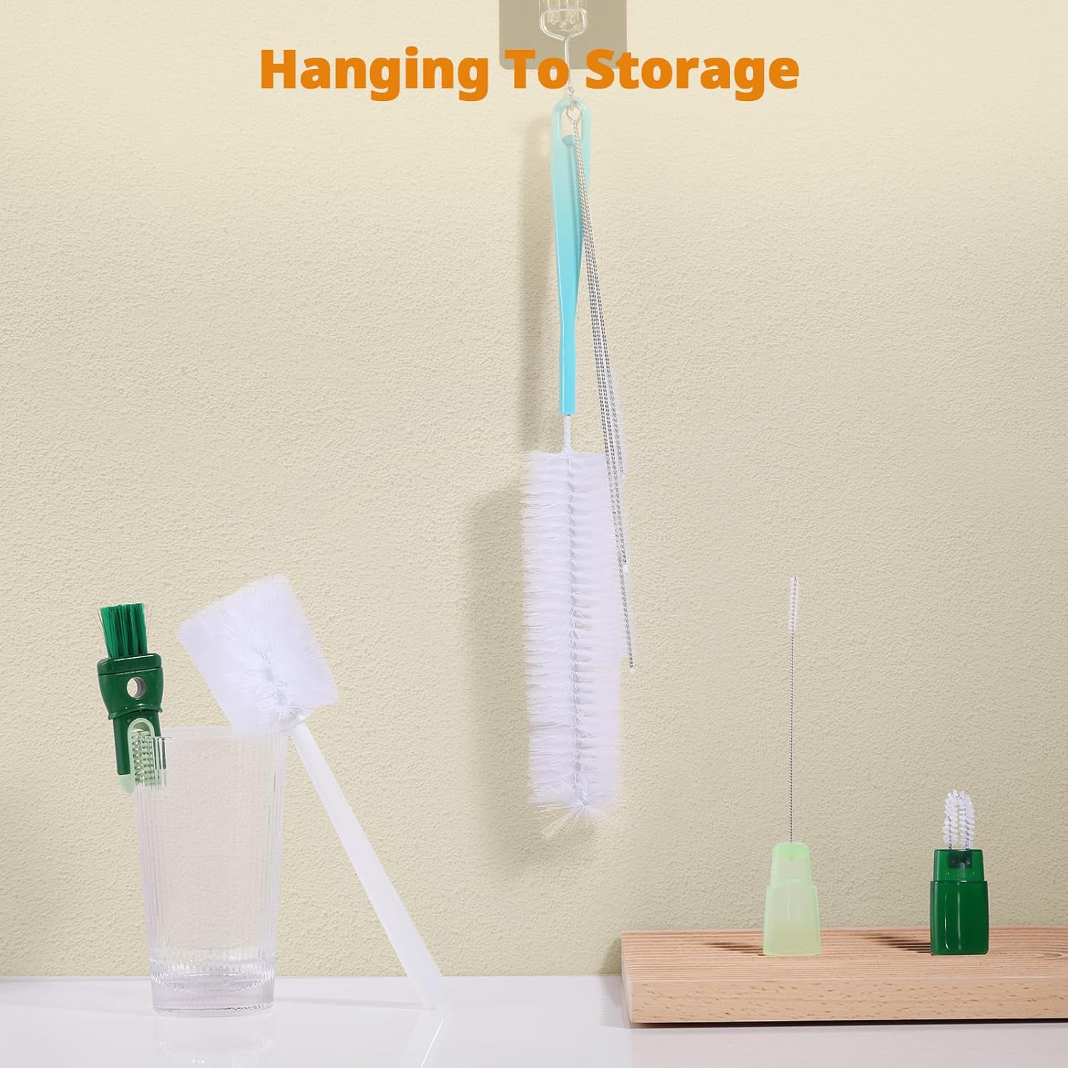 - 【Space-saving】5-in-1 bottle brush is detachable and reassemblable, detail Brush nest inside brush handle when not in use, travel-friendly. Hanging hole at the end of all brush, be hung to store without occupying too much space.