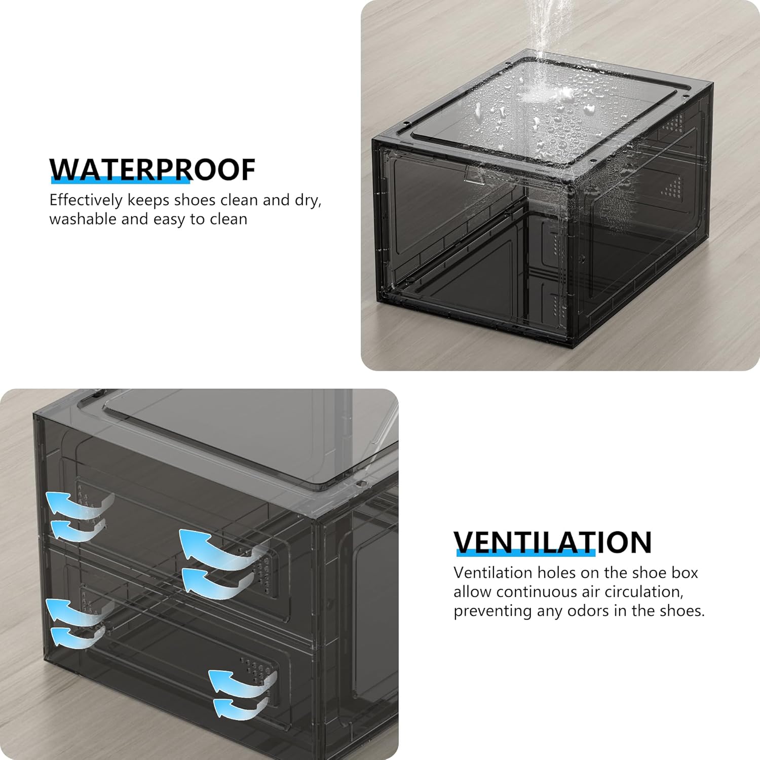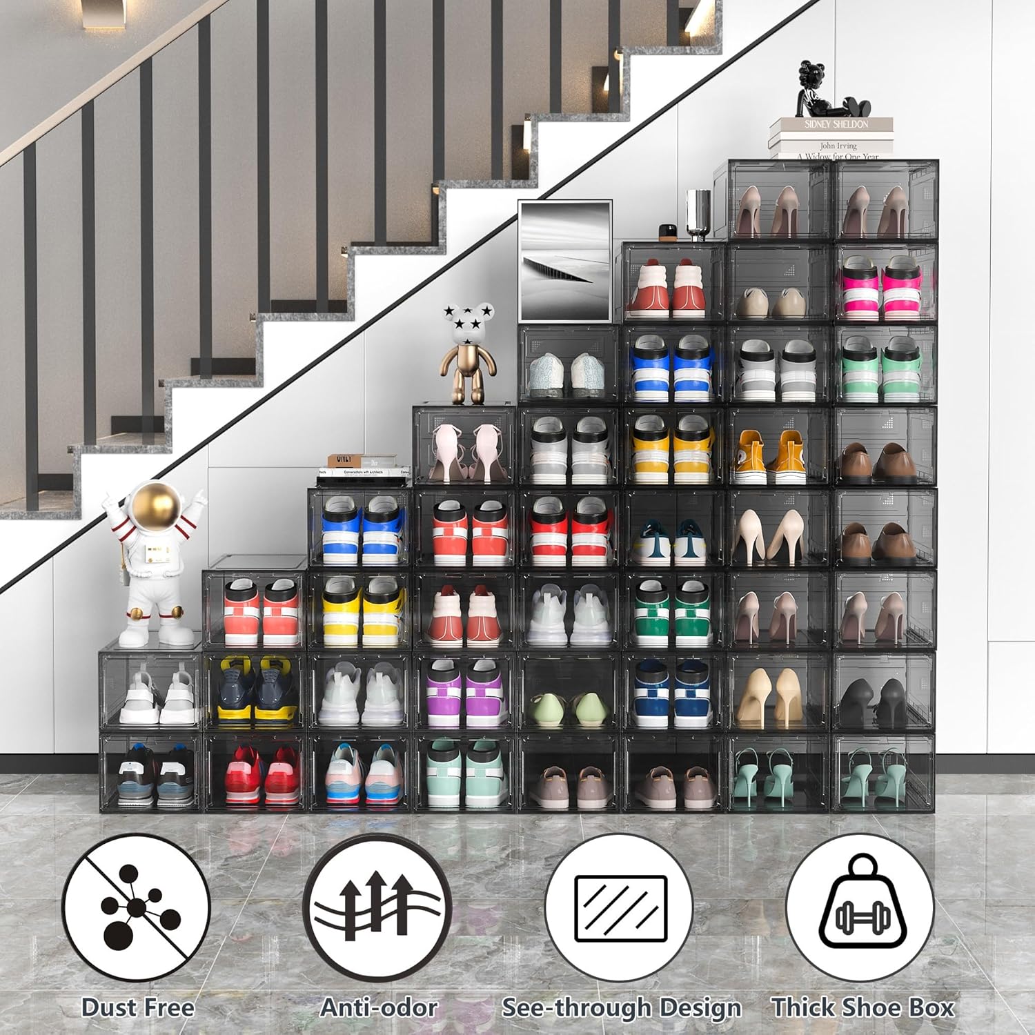 - Upgraded Hard Shoe Boxes:Say goodbye to soft plastic shoe boxes! Made of from sturdy hard plastic on all six sides, our shoe boxes boast exceptional durability and load-bearing capacity. Additionally, their transparent design ensures easy viewing of your shoes.