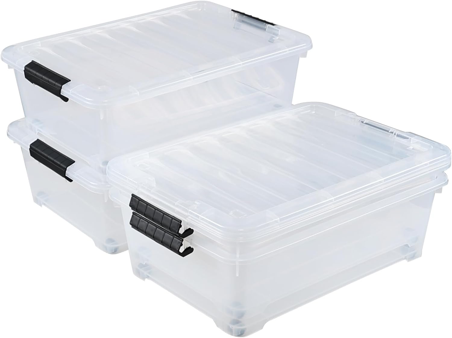 4 Packs 20 Quart Plastic Under Bed Storage Container with Lids and Wheels, Stackable and Nestable Organizer Bins, Flat Storage Box