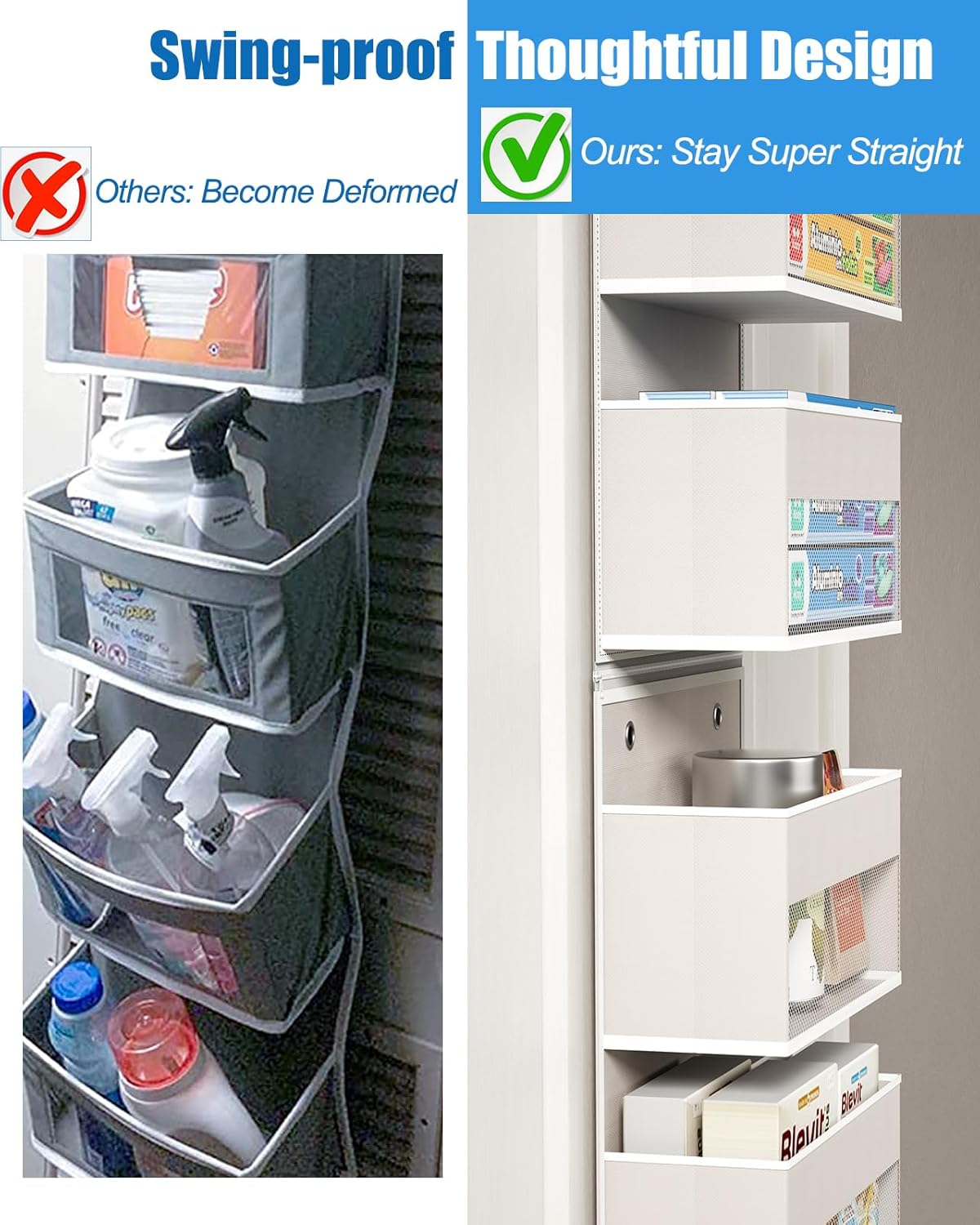 - - Premium Material: Thicker cardboard, heavier non-woven fabric, metal hooks, and loops offer better holding capacity & durability