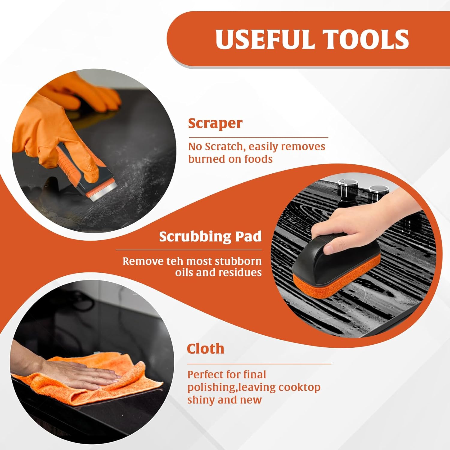 - Gentle Non irritating : Stove top cleaner kit uses an safe formula that is free from harmful chemicals, friendly to both family and pets.The glass cooktop cleaner rinses off easily without leaving residue, ensuring cooktop is not only clean but also safe