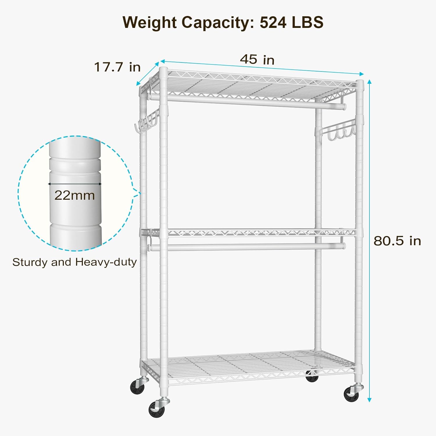 - [Dimension & Load Weight]: 45"W x 17.7"D x 80.5"H(Included wheels height) with 22mm diameter poles, max load 524 pounds