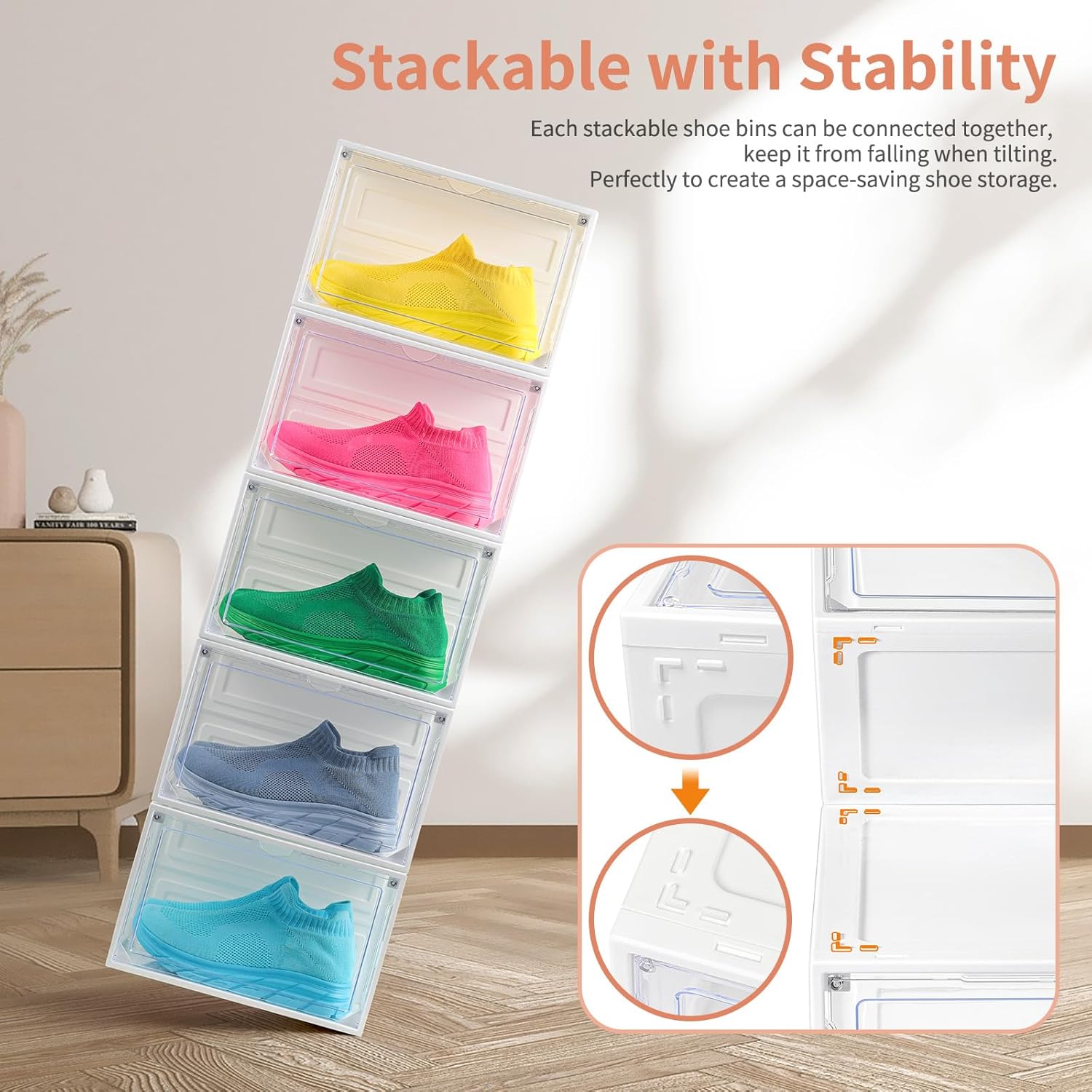 12 Pack White Shoe Boxes Stackable,Large Shoe Storage Organizer with Magnetic Door,Drop Side Shoe Containers for Entryway,Sneaker Storage Fit up to US Size 12 for Men/Women(13’’x10.62”x8.26”