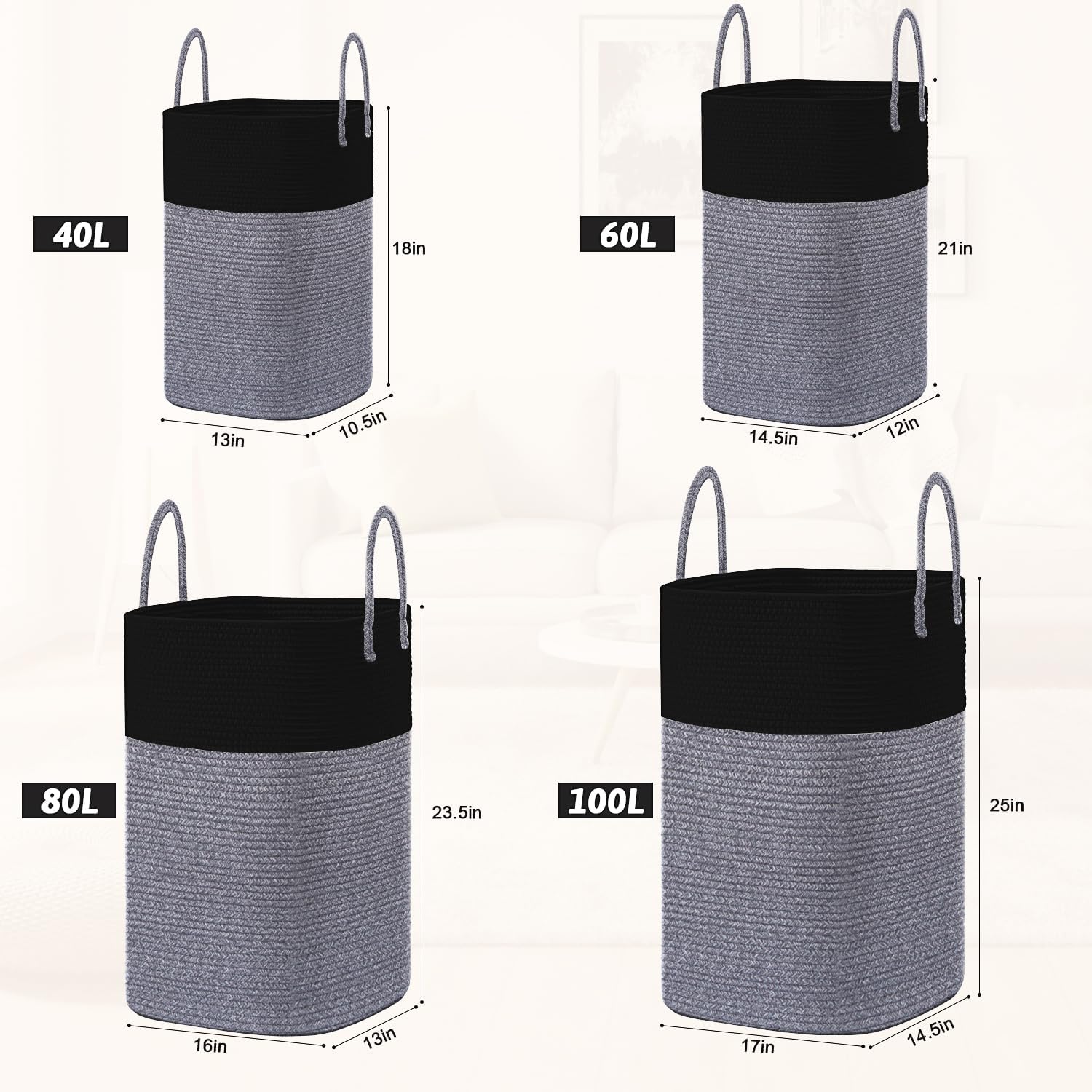 Laundry Basket,Woven Cotton Rope Laundry Hamper,Versatile Storage for Dirty Clothes,Baby Toys,and Blankets in Bathroom, Nursery,and Living Room (Black, 80L)
