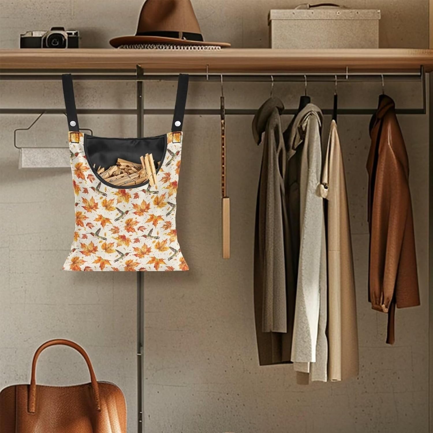 Maple Leaf Large Capacity 14.5 x 12 Inch Clothespin Bag with Hanging Hook Hummingbird Waterproof Clothes Pin Hanging Bag Clothespin Storage Organizer with Large Opening