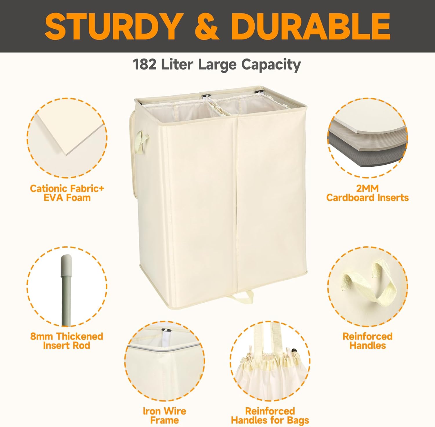 182L Oversized Laundry Hamper 2 Section with Lid and Removable Bags,Double Laundry Basket 30in Dirty Clothes Hamper 2 Dividers for Bedroom,Laundry Room,Bathroom,Dorm Beige White
