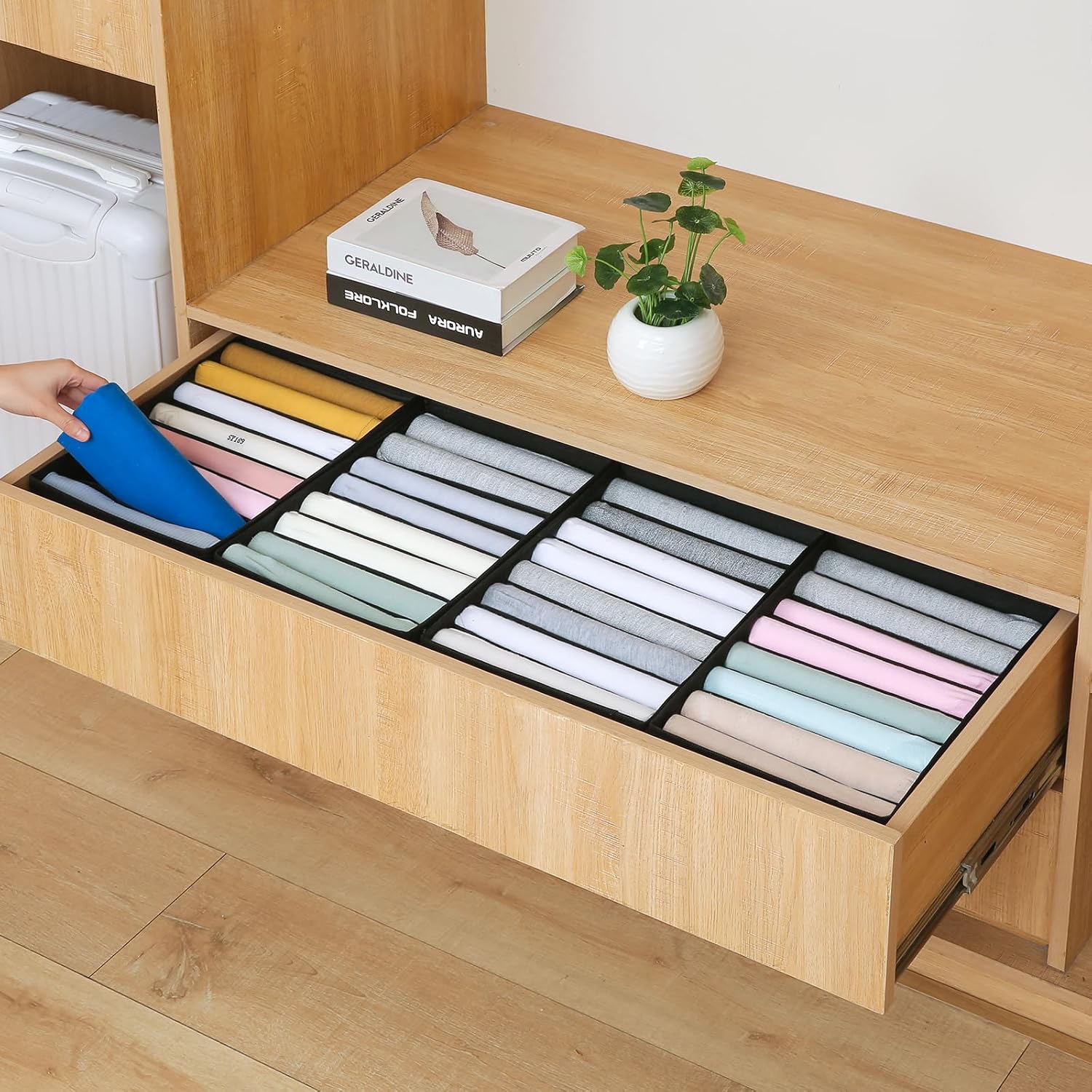 - PREMIUM QUALITY MATERIAL: The shirt organizer for folded clothes are made of PBT fabric, which is moisture-proof and very durable. The square boards are made of PP (Polypropylene), which is high heat-proof, smooth and light. These drawer organizers for clothing are washable, but the fabric contains a hard PP board, so please wash them by hand instead of using the machine.