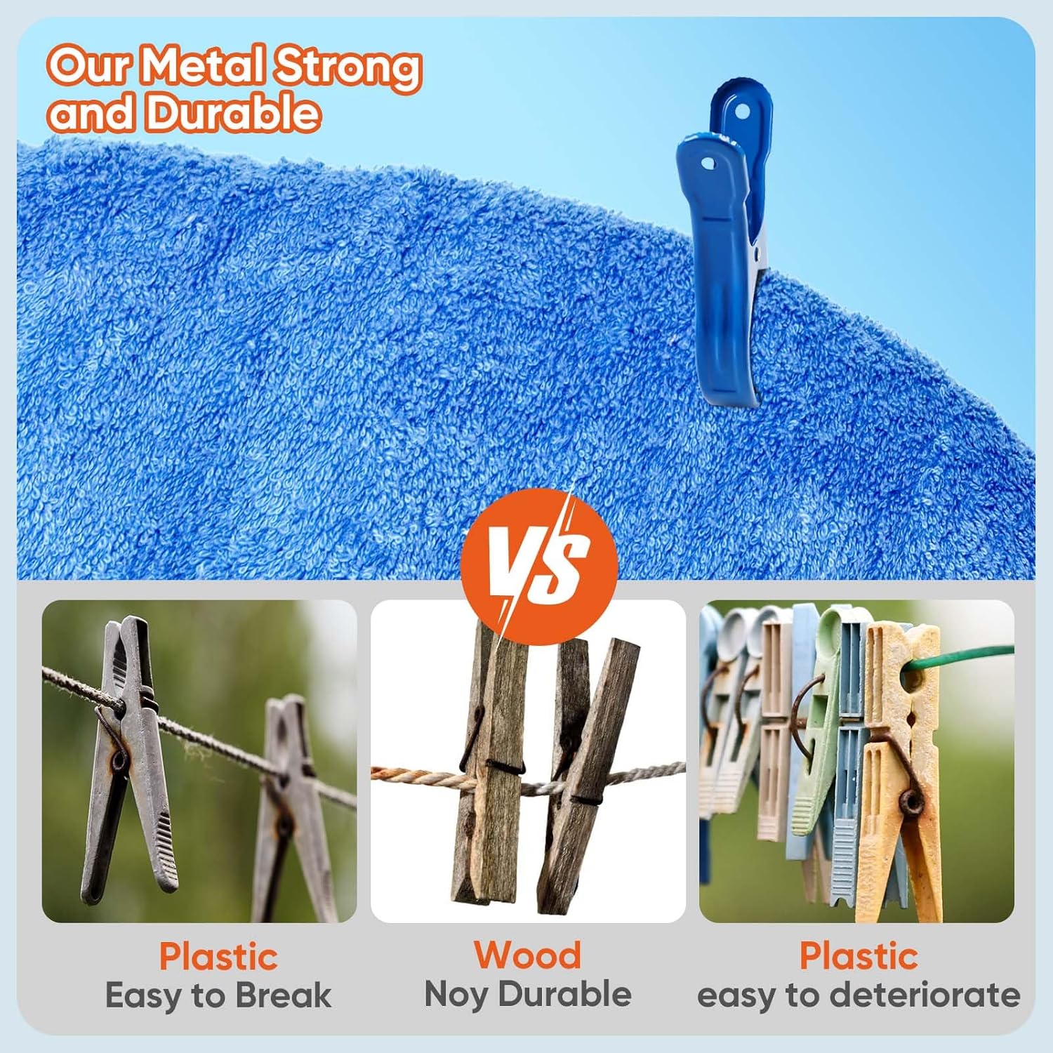 - Blue beach chair clips: these beach towel clips are made of high quality steel with electroplated surface to prevent anti-rust and anti-corrosion , compared to plastic clips, metal towel clips for chairs are stronger and won't fade or break over time