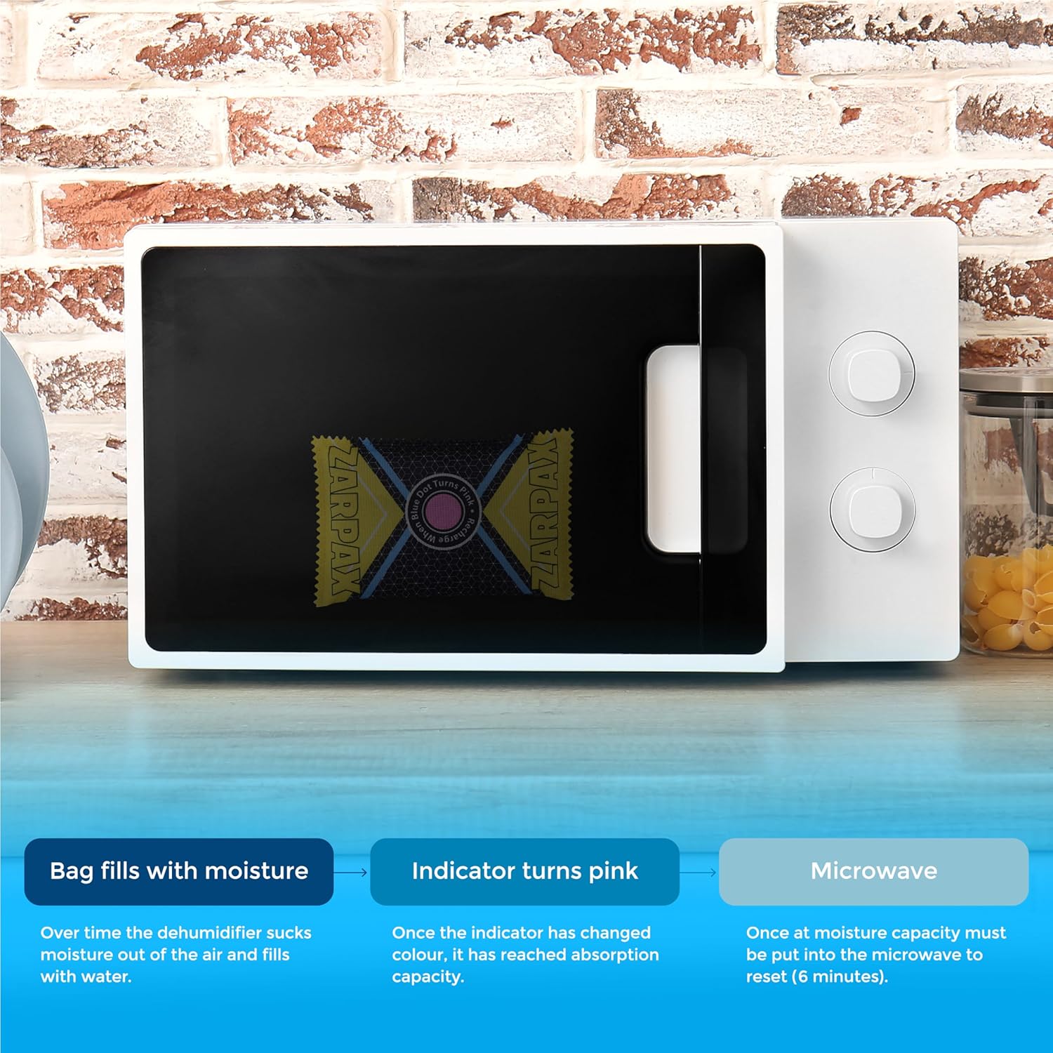 - QUICK & EASY REGENERATION: Our reusable moisture absorbers boast an innovative humidity indicator that signals when rejuvenation is needed. When the humidity indicator changes color to pink, it's time to recharge. Place the moisture absorber in your microwave for just 6 minutes to dry out the silica gel. No need to ever buy expensive refills or waiting for hours and hours like with traditional methods!