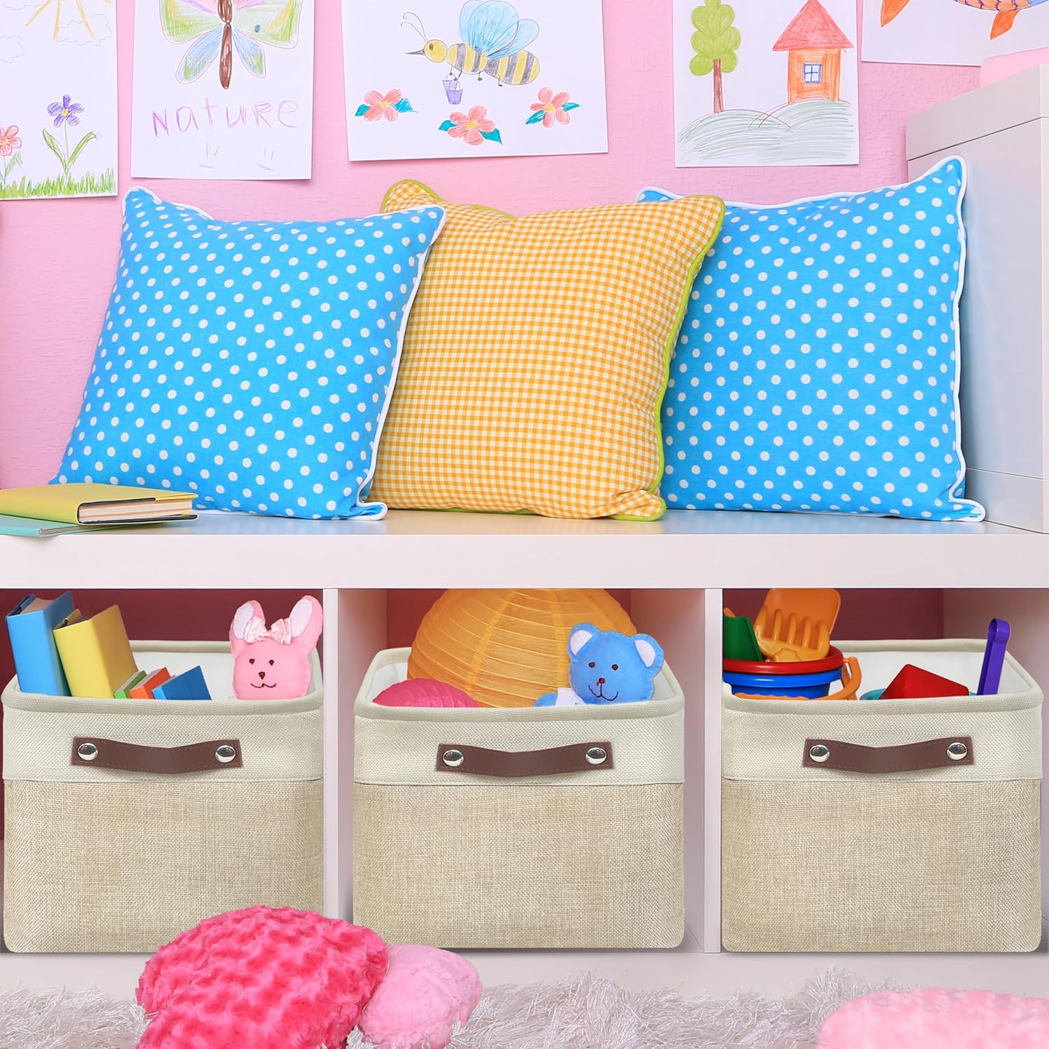 SIMPLE HOUSEWARE Large Fabric Storage Bin, 15" x 11" with Leather Like Handles, 3 Pack, Beige