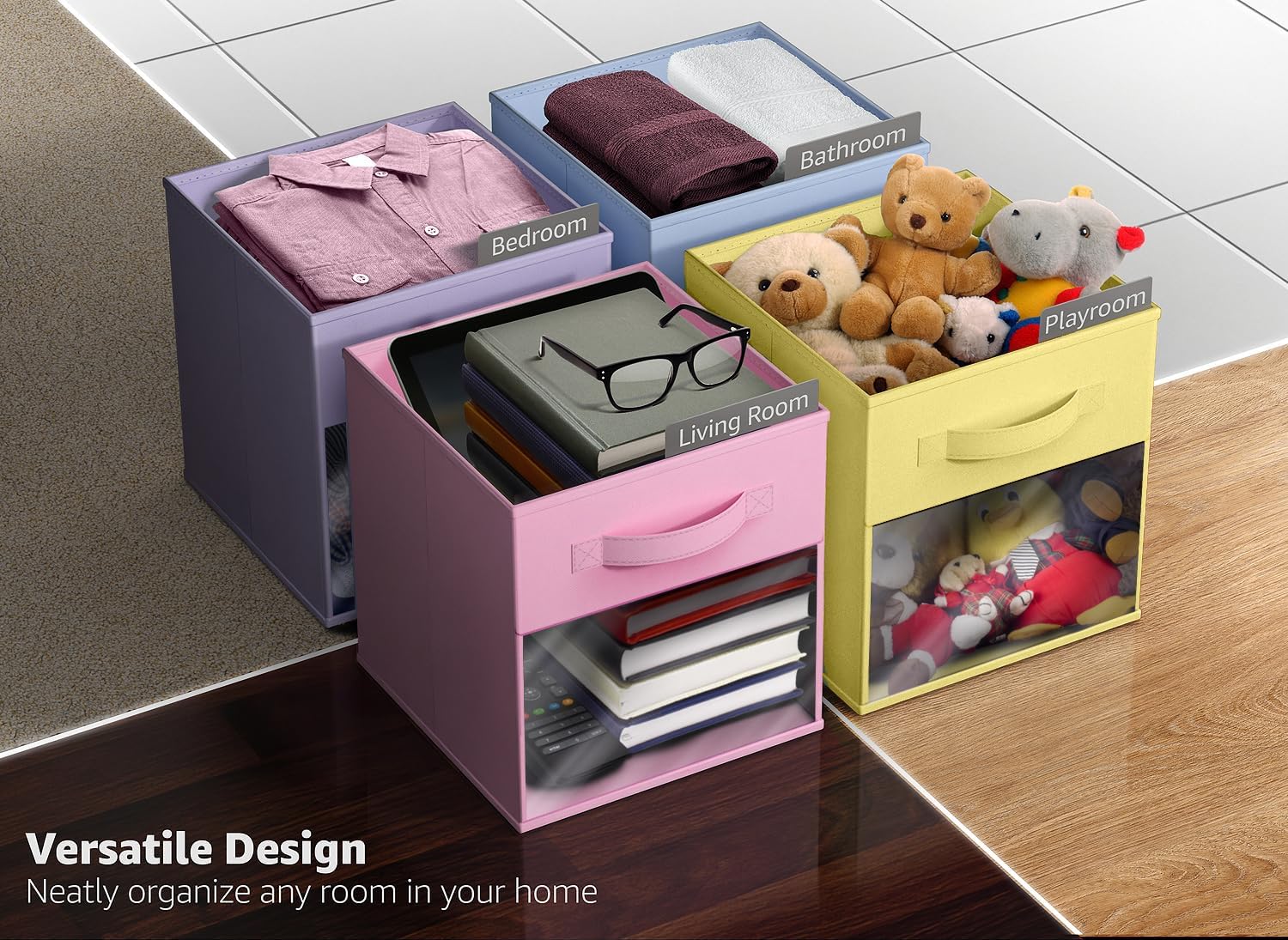 Sorbus 11 Inch Storage Bins with Clear Window - 6 Foldable Baskets for Organizing Clothes, Toys, Books - Sturdy Collapsible Fabric Storage Cubes with Handle - Storage Baskets for Shelves, Closets