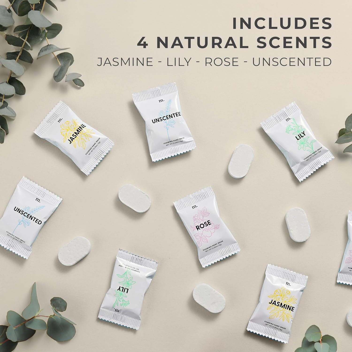 - This Soap Refill Pack Includes: 4 Rejuvenating Soap Refills in Rose/Jasmine/Lily/Unscented and 1 clear foaming soap bottle. Bottle will come with preprinted hand soap labels.