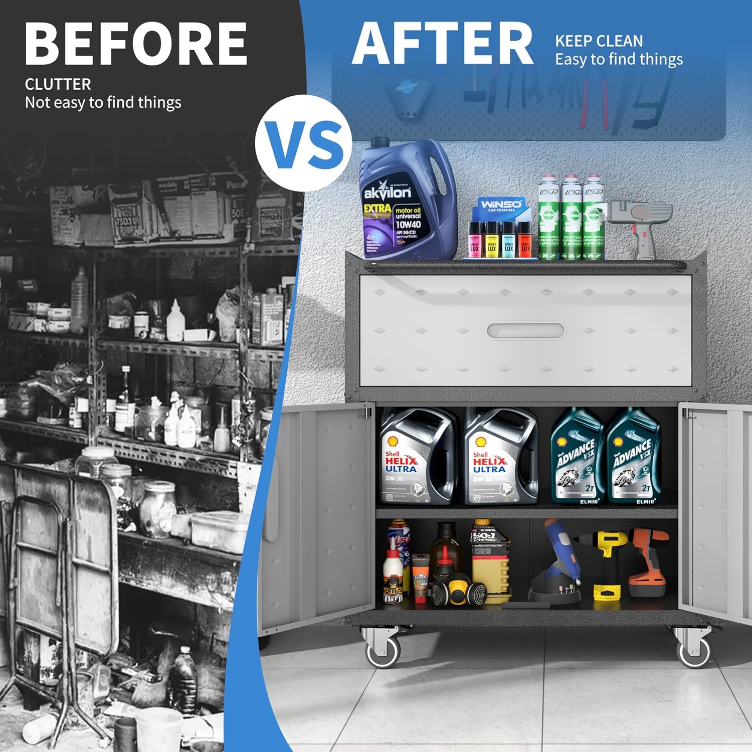 - MULTIPLE STORAGE OPTIONS: The cabinet measures 16.54"D x 29.53"W x 34.66"H. The cabinet comes with 1 large capacity drawer and 2 lockable doors and the top of the cabinet can also be used as a workbench. It is perfect for storing tools in the garage.