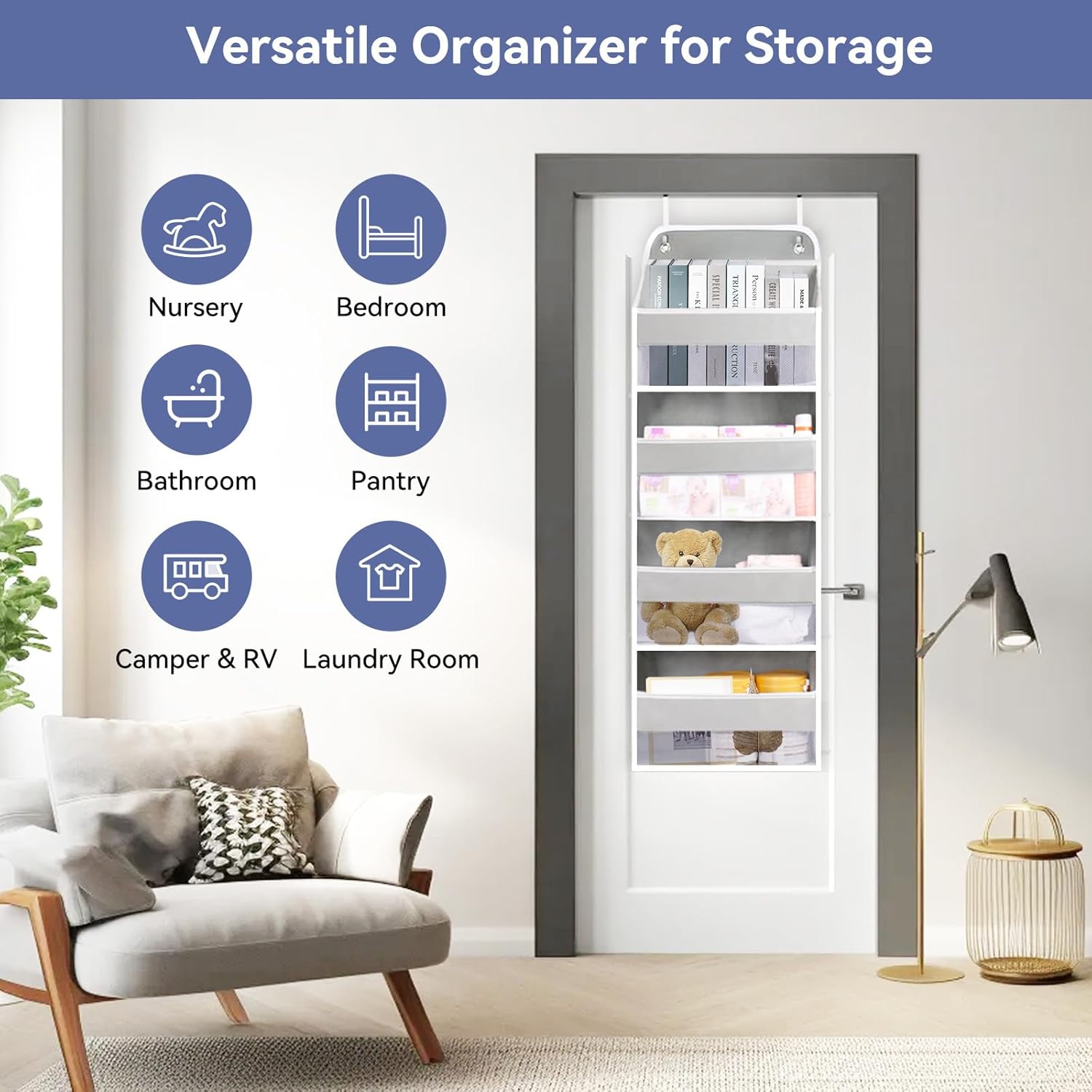 - TOP EASY INSTALLATION: Our Over Door Organizer can be effortlessly installed without any tools. With three width adjustable metal hooks, making this over the door storage organizer universally fits for most of the doors less than 1.98" thick. What you need to do , is just put the hooks onto the door without making holes on the door