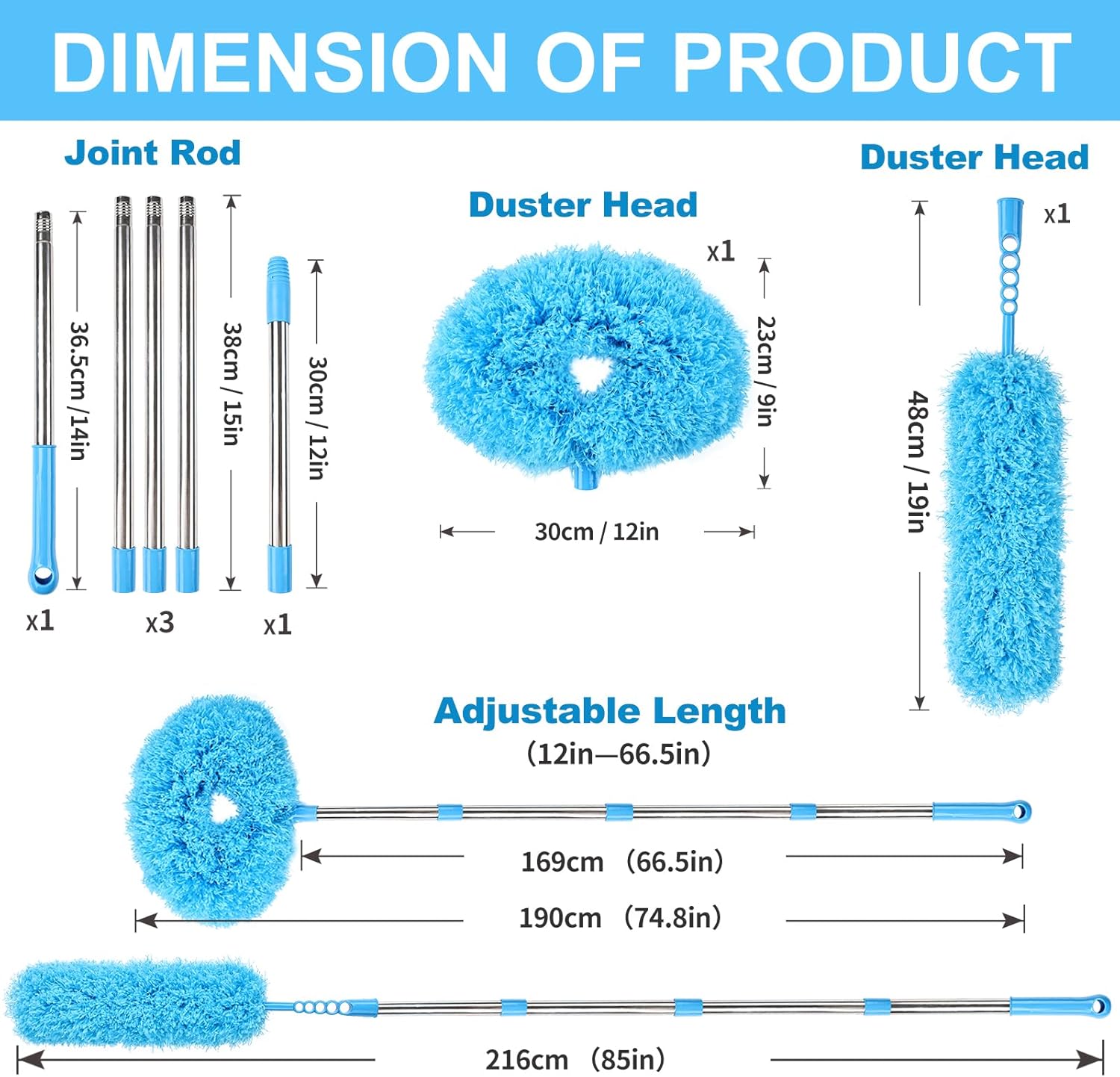 - Product Specifications: This comprehensive duster kit includes a 66.5inch extension pole (stainless steel pole can be installed to suit your needs), 1pcs microfiber fan duster head and 1pcs normal microfiber duster head. Multiple uses for one pole, easy to solve a variety of dust